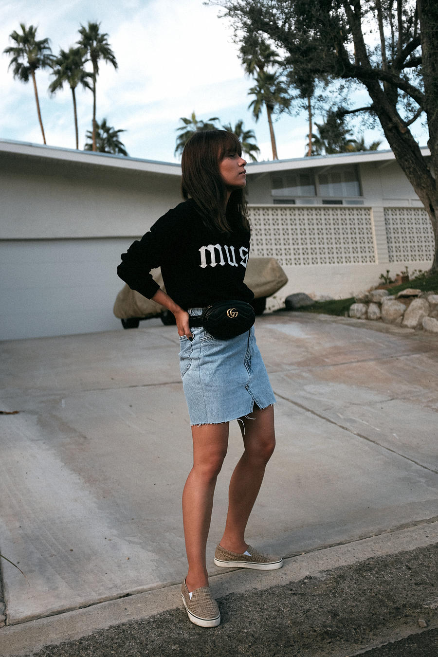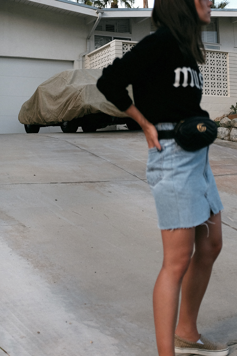 „Muse“ sweater – Ragdoll LA (similar). Denim skirt – Levi’s. „GG Marmont“ belt bag – Gucci. Slip-ons – Isabel Marant.