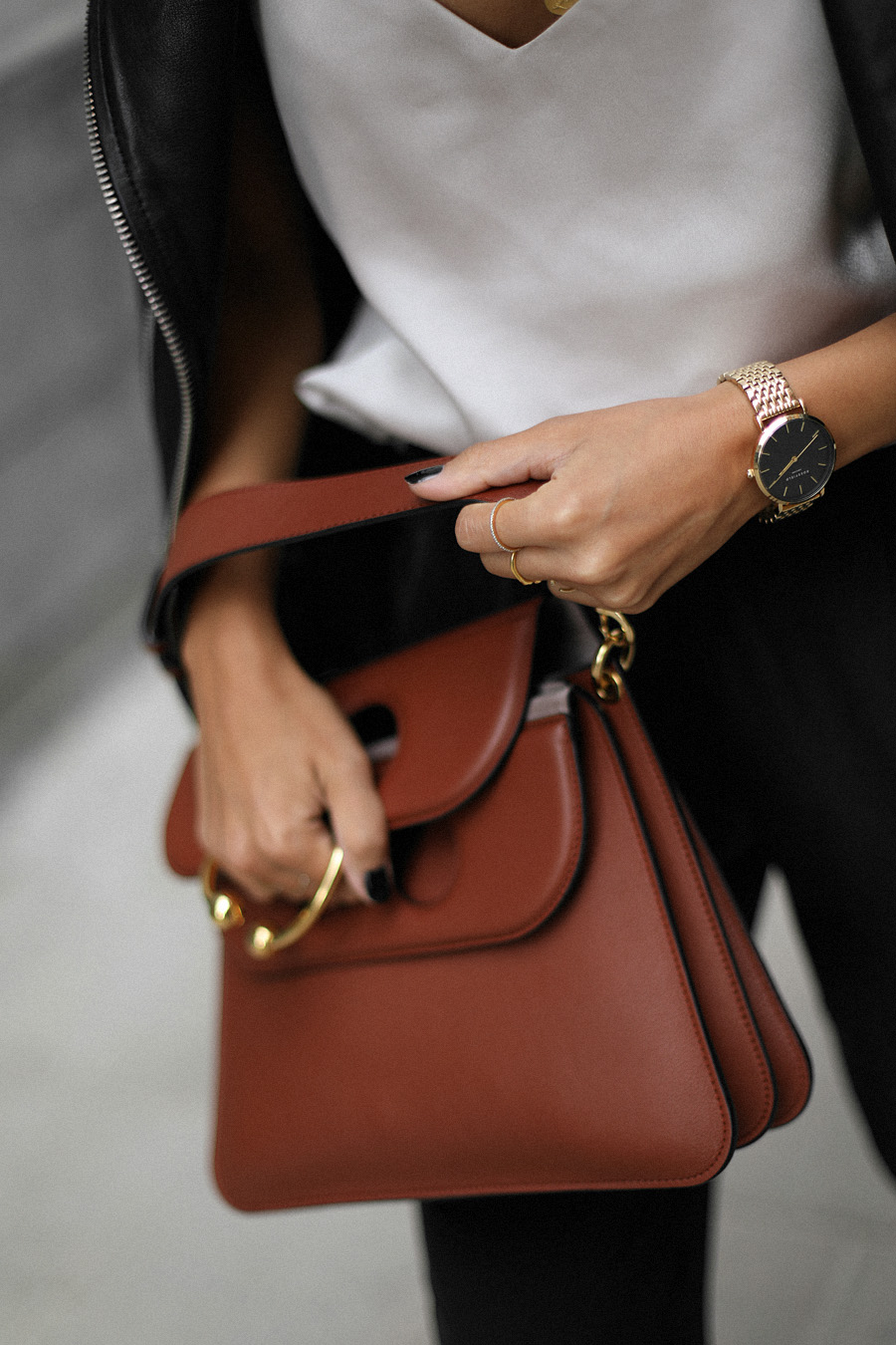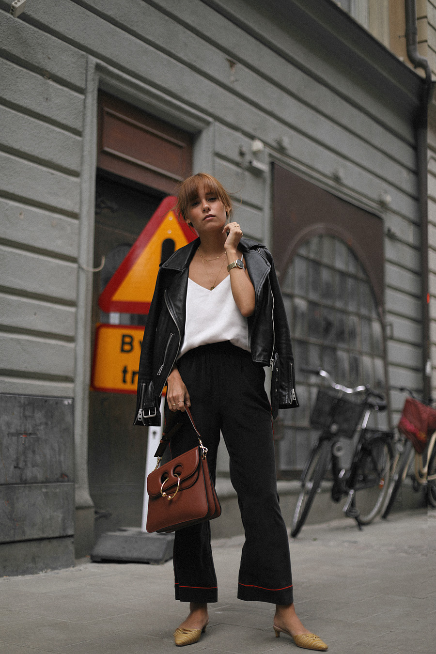 wearingSilver top – EDITED the label. Silk pants – Ganni. Leather jacket – All Saints. Vintage Mule Pumps – Prada. (similar). Brown „Pierce“ bag – J.W. Anderson. „Upper East Side“ Watch – Rosefield.
