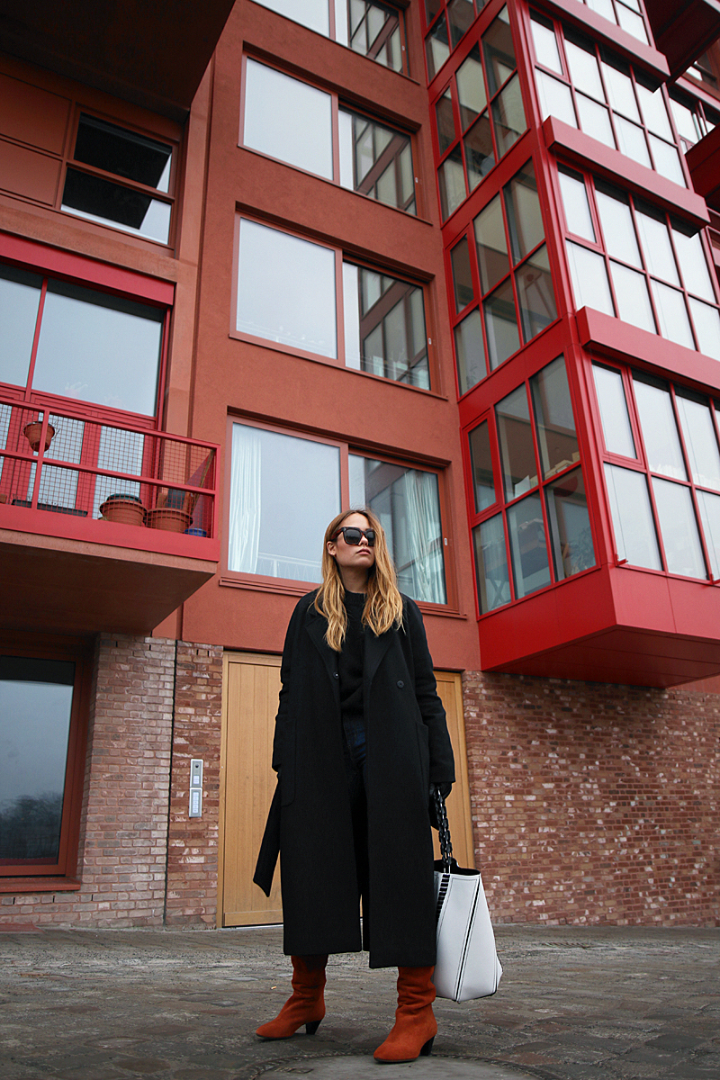 wearingCoat – Edited the Label. Knit jumper – Wood Wood (similar). Skinnyjeans – Cheap Monday (similar). Orange boots – Isabel Marant Étoile. Sunglasses – Céline. Gloves – H&M (similar). ‚Hex‘ bag – Proenza Schouler.