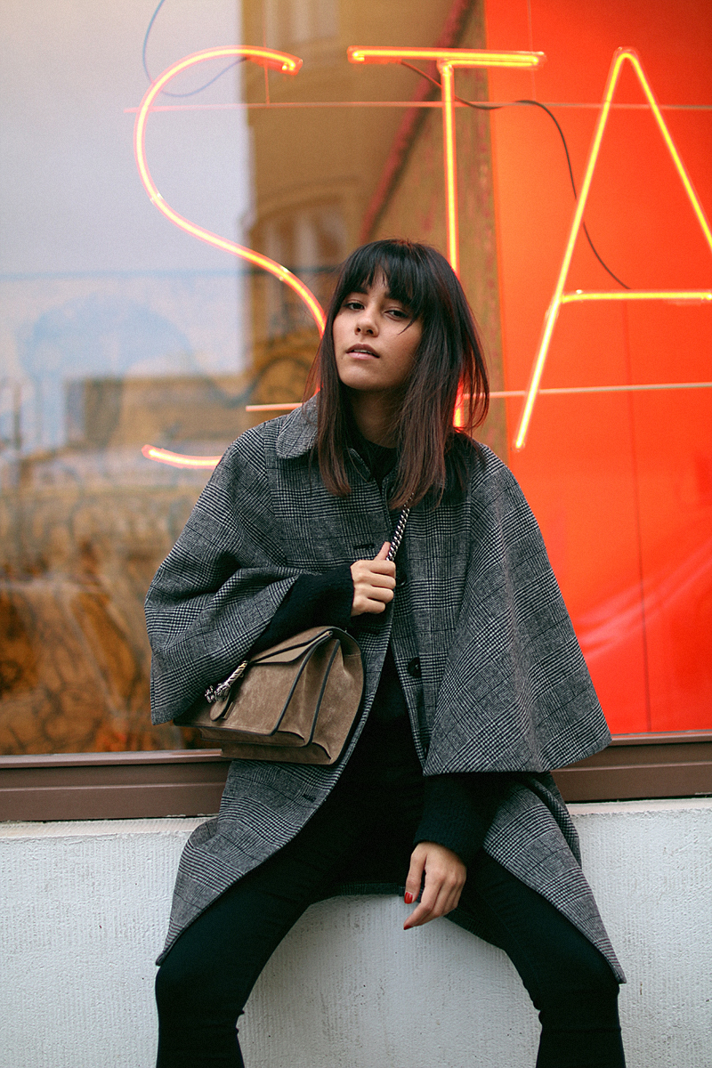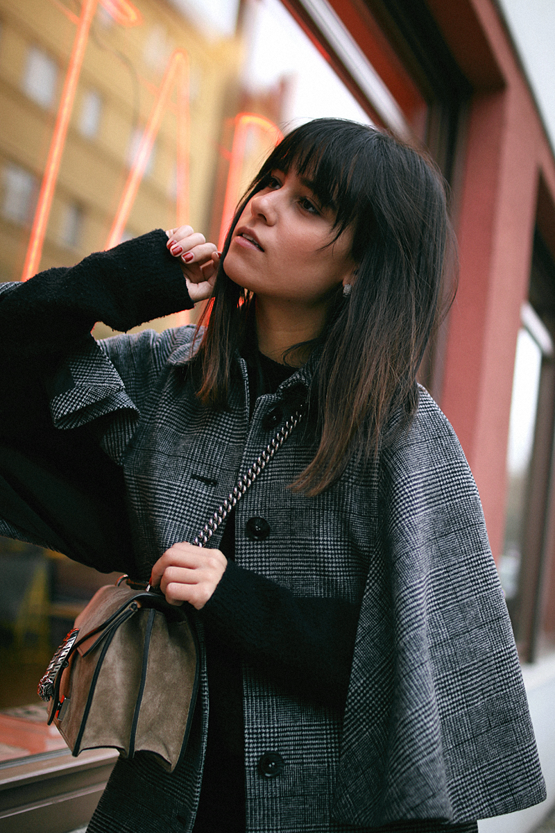 Ich trage ein CapeMint&Berry mit Glencheck-Muster, welches ursprünglich aus der Herrenmode stammt und in Anzügen und Hemden zu sehen war. Neu interpretiert als Cape versprüht es einen gewissen Vintage Feel & Romantic Vibes! Die Ärmel erzeugen nicht nur eine interessante Silhouette, man kann darunter auch noch schichten was das zeug hält. Ich wählte dazu einen Look in all black, damit das Cape schön zur Geltung kommt. Die Tasche und die Boots in hellbraunem Wildleder bilden schöne farbneutrale Akzente. Dieser Look ist ein kleiner Vorgeschmack auf ein Adventskalendertürchen, welches wir zusammen mit Mint&Berry vorbereitet haben! Stay tuned!