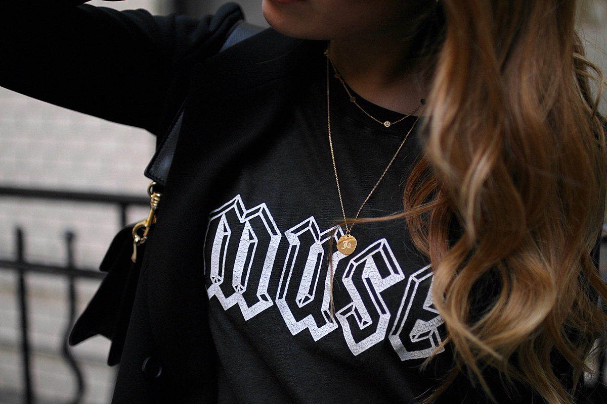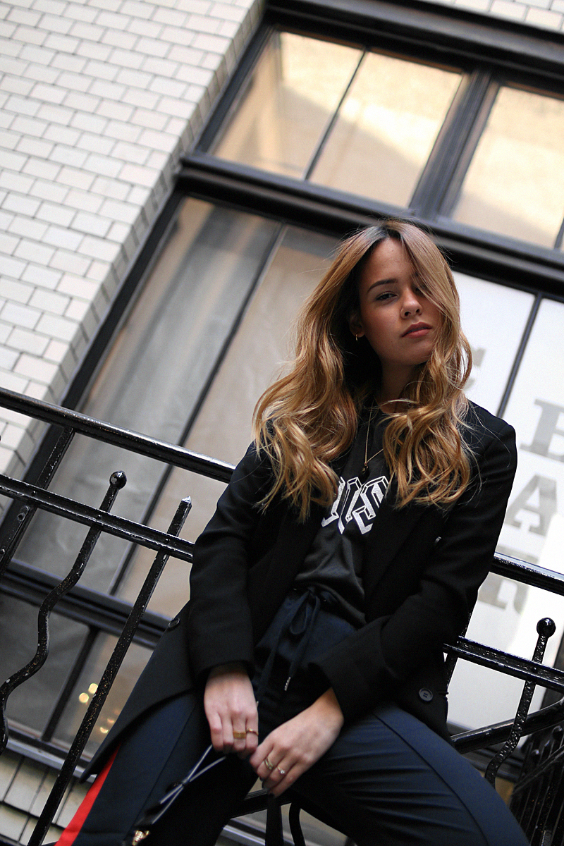 Es geht weiter mit Athleisure. Diesmal mit einer unschlagbaren Kombi: Printshirt und Blazer. Doppelreihige Blazer mag ich momentan am liebsten, denn das sind meiner Meinung nach die einzigen Blazer, die man auch geschlossen tragen kann – wie wäre es zum Beispiel mit nur einem Spitzen-BH darunter? Auch wenn dieser Blazer eher an die 80er erinnert, sieht er doch am modernsten aus. Taillierte Blazer mag ich überhaupt nicht, auch deswegen greife ich lieber zum Boyfriend-Schnitt. Damit kann man auch viel besser spielen: Boyfriend-Blazer zu einem Lacklederminirock – also weit und lang zu kurz und eng. Oder man kombiniert weit mit weit, so wie in meinem Outfit. Eine feine Hose (im sportlichen Look, aber aus einem eher feinen Stoff) zu einem feinen Blazer und einer kleinen Lederhandtasche. Das sieht schick aus, hat durch die weiten Schnitte und den Sneakers aber was unheimlich lässiges, oder? Und das Printshirt gives the edge.