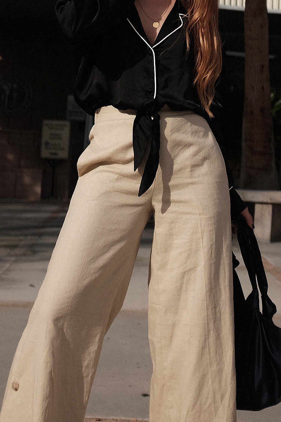 Pyjama-style silk top – Aritzia (similar here or here). Wide pants – Style Nanda (similar). „Ascot“ bag – The Row (similar). „Aurelie“ watch – Karl Lagerfeld. „Emma“ sunglasses – Céline. Earrings – Teetharejade x Stilnest.