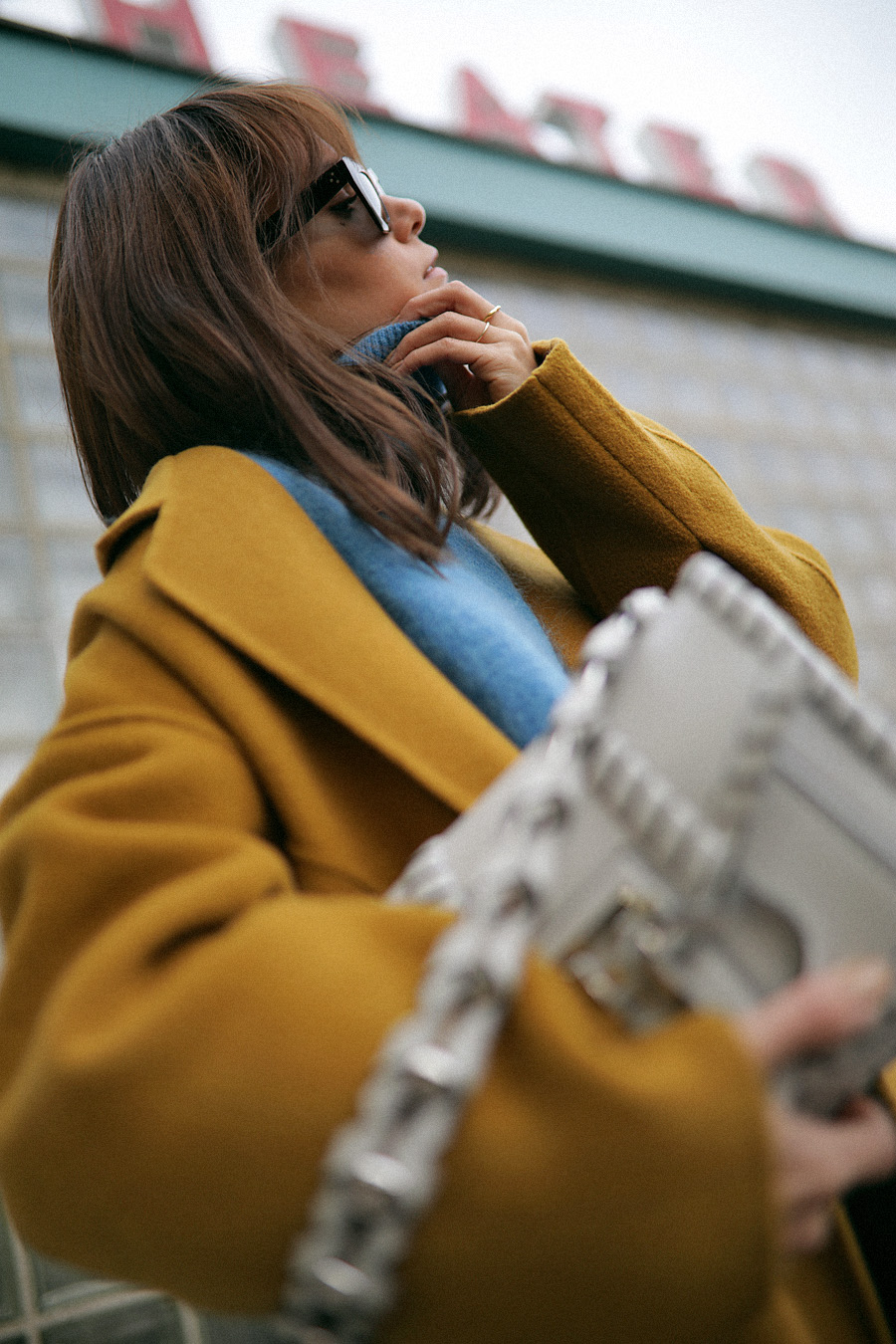 Mom Denim Jeans – Edited the Label. Blue Turtleneck Sweater – H&M. Yellow Coat – 3Rooms (similar). „Hava“ Bag – Proenza Schouler. Flats – & Other Stories. „Eva“ Sunglasses – Céline.