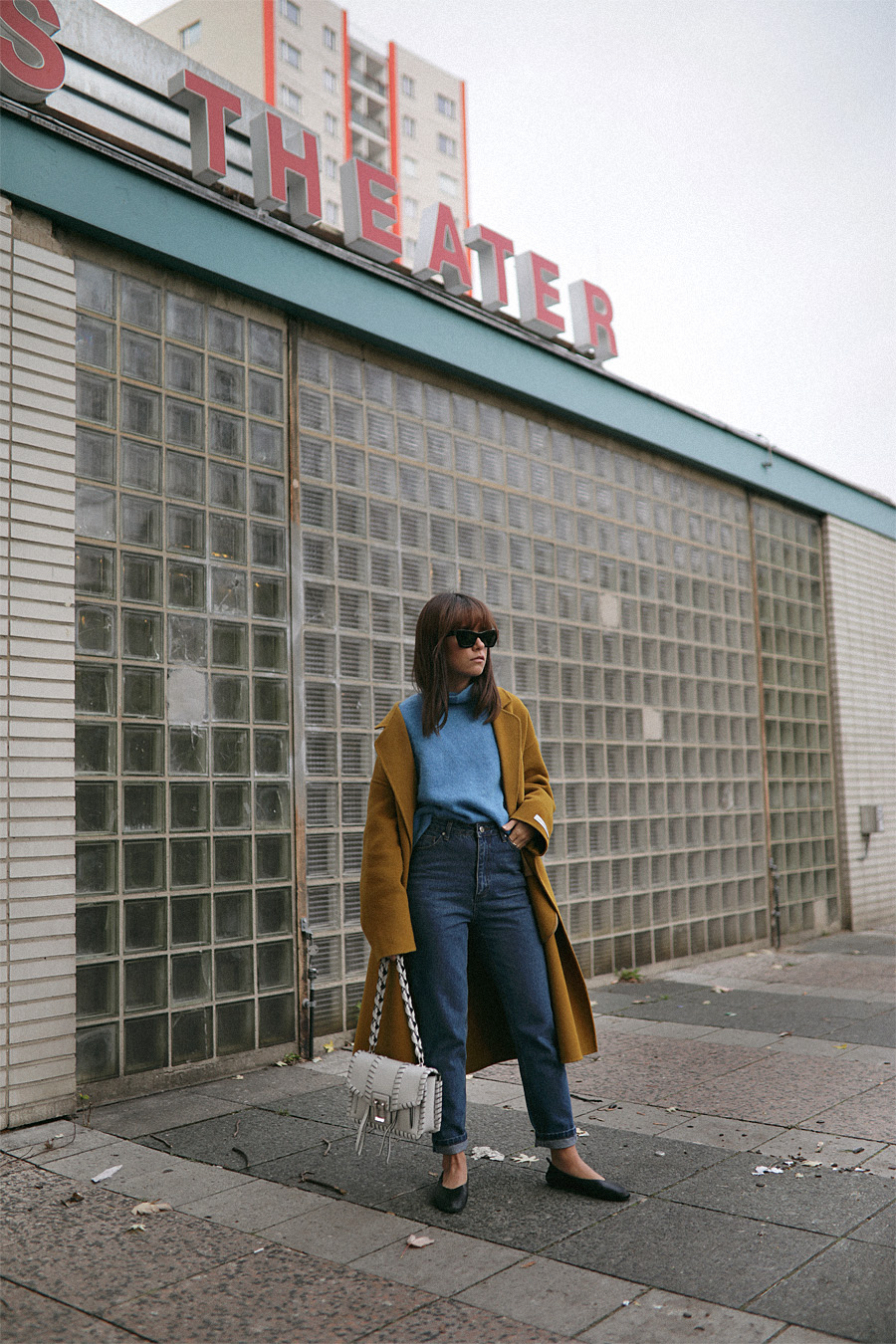 wearingMom Denim Jeans – Edited the Label. Blue Turtleneck Sweater – H&M. Yellow Coat – 3Rooms (similar). „Hava“ Bag – Proenza Schouler. Flats – & Other Stories. „Eva“ Sunglasses – Céline.