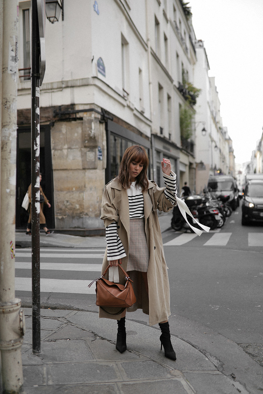 Striped sweater – EDITED the label. Trench Coat – Murmuring (similar). Checked skirt – from Korea (similar). Stretch Boots – Mango. „Puzzle“ bag – Loewe.