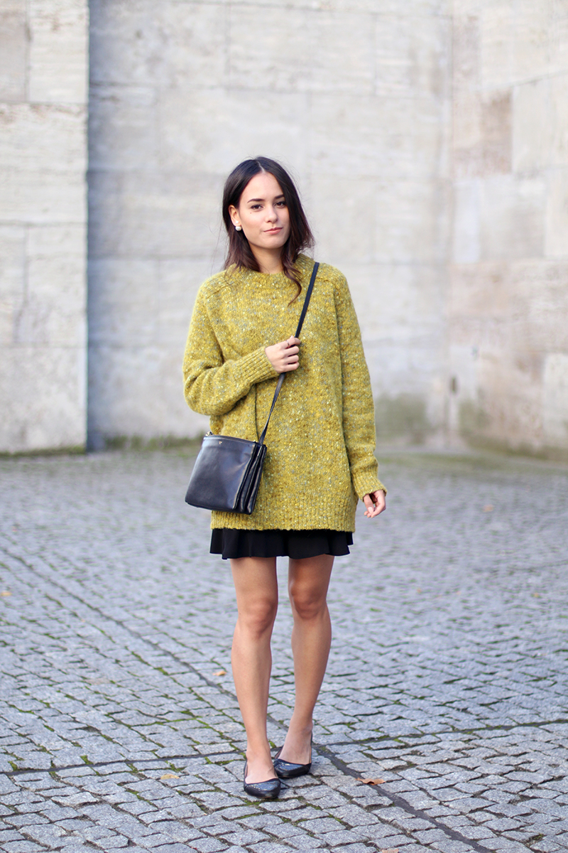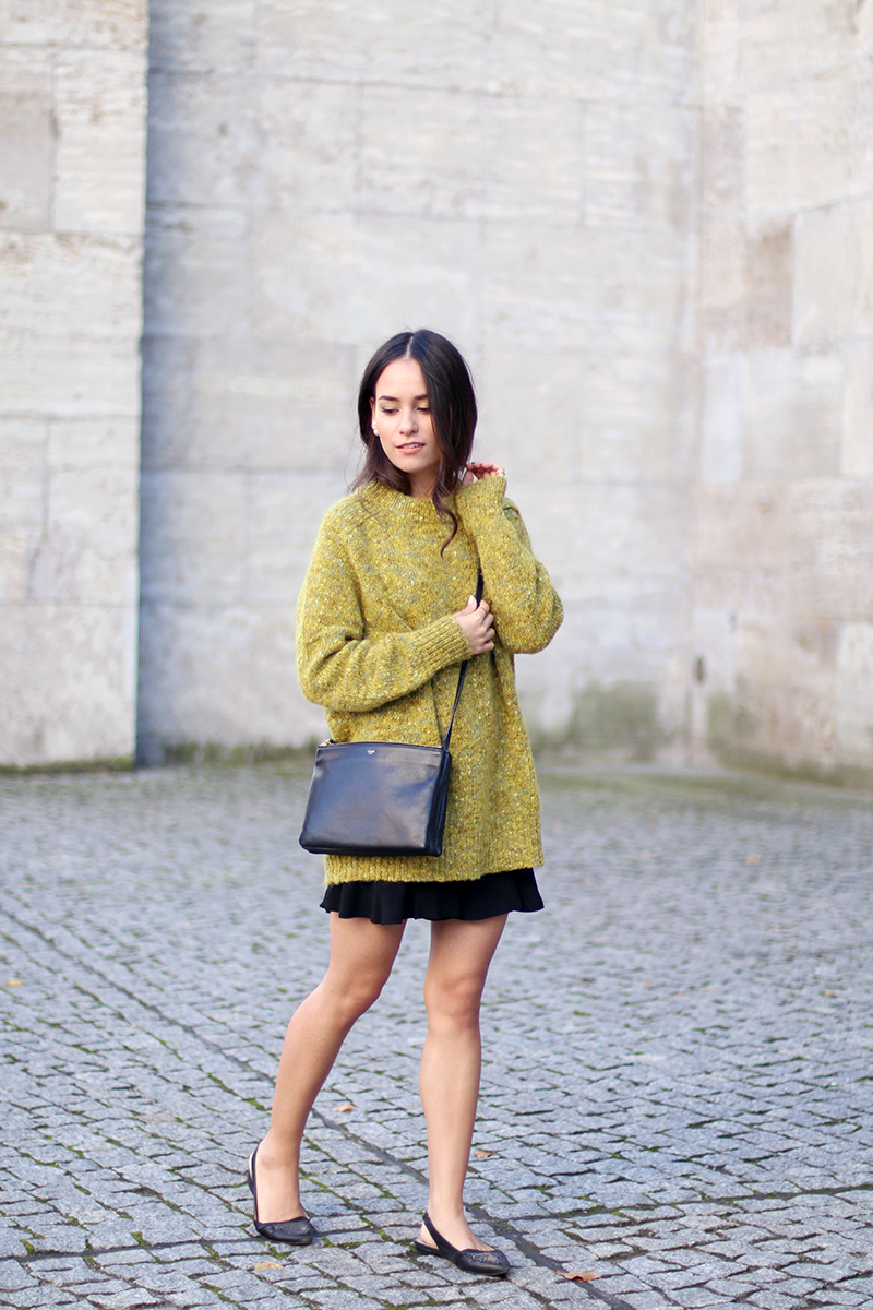 Hey Celine! Dass du den Pullover nicht toll findest, ist doch vollkommen okay :) Muss nicht jedem sein. Nur solche Sachen von wegen „unvorteilhaft“ oder „vorteilhaft“ finde ich sehr schwierig. Ich nehme mir mal heraus zu sagen (und das soll echt nicht eingebildet sein :D), dass ich alles tragen kann. Warum – Weil ich weder einen zu langen oder zu kurzen Oberkörper habe oder zu lange oder zu kurze Beine. Ich muss nicht darauf achten, ob mich etwas zu dick, zu dünn (ok das vielleicht), zu kurz oder zu lang aussehen lässt. Ich bin zwar eine zierliche Person, aber das ändert nichts an den Proportionen, die halte ich persönlich eigentlich für perfekt (wie gesagt, nicht arrogant gemeint!). Weswegen sollte ich dann keine flache Schuhe dazu anziehen, frage ich mich. Zumal sie dazu einfach viel zu overdressed-gewesen wären (Minirock und hohe Schuhe stempel ich persönlich schnell als ‚billig‘ ab).