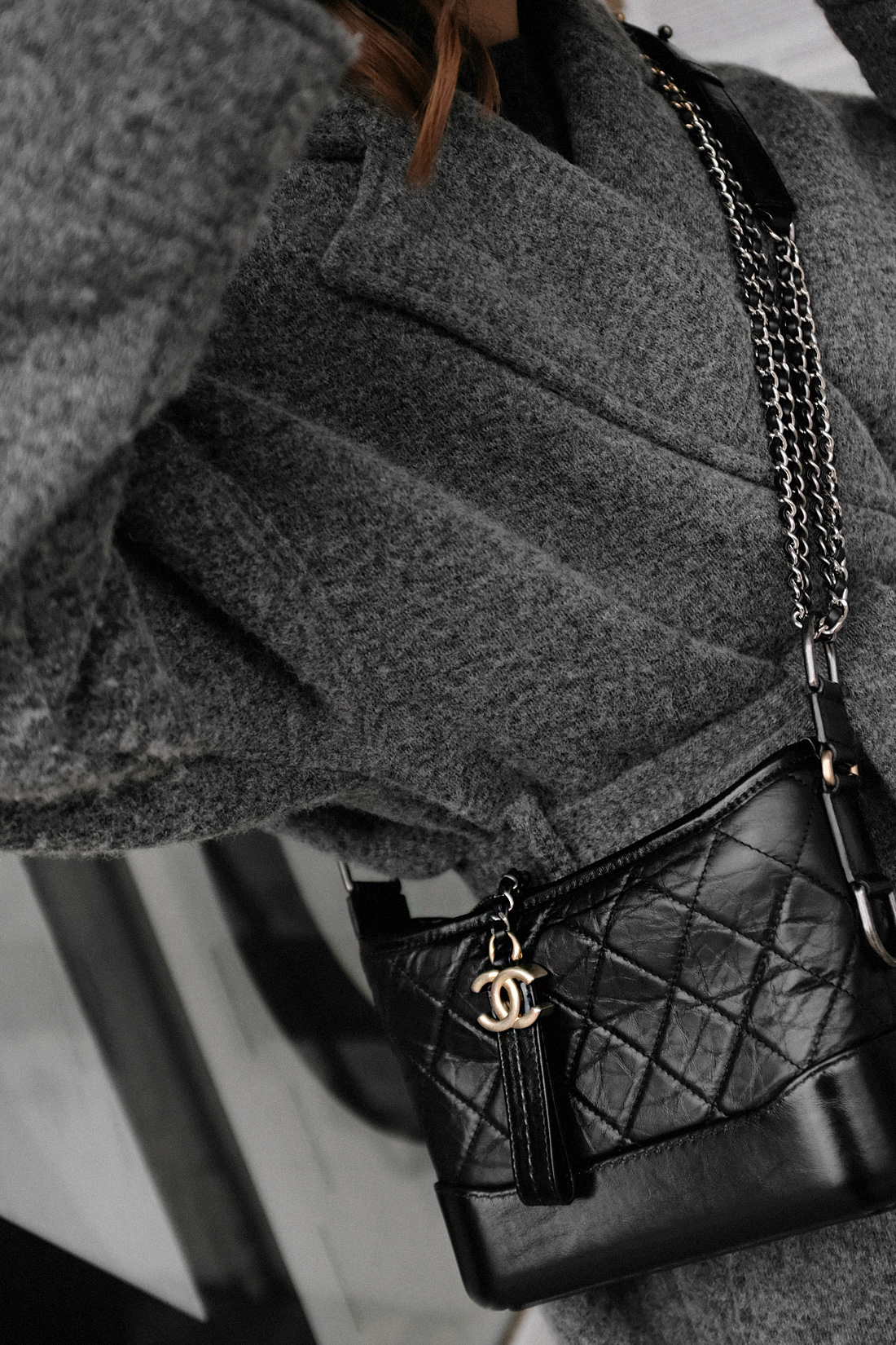 Grey belted coat – EDITED the label. Black sock boots – Mango (similar). Black mom jeans – EDITED the label. „Gabrielle“ bag – Chanel (similar). Bucket hat – Arket. Leather gloves – COS (similar).