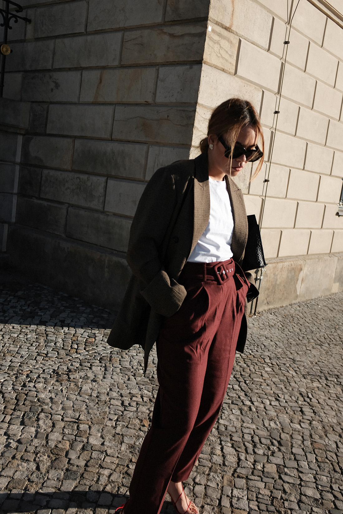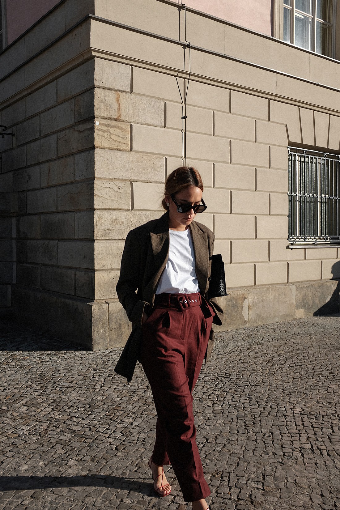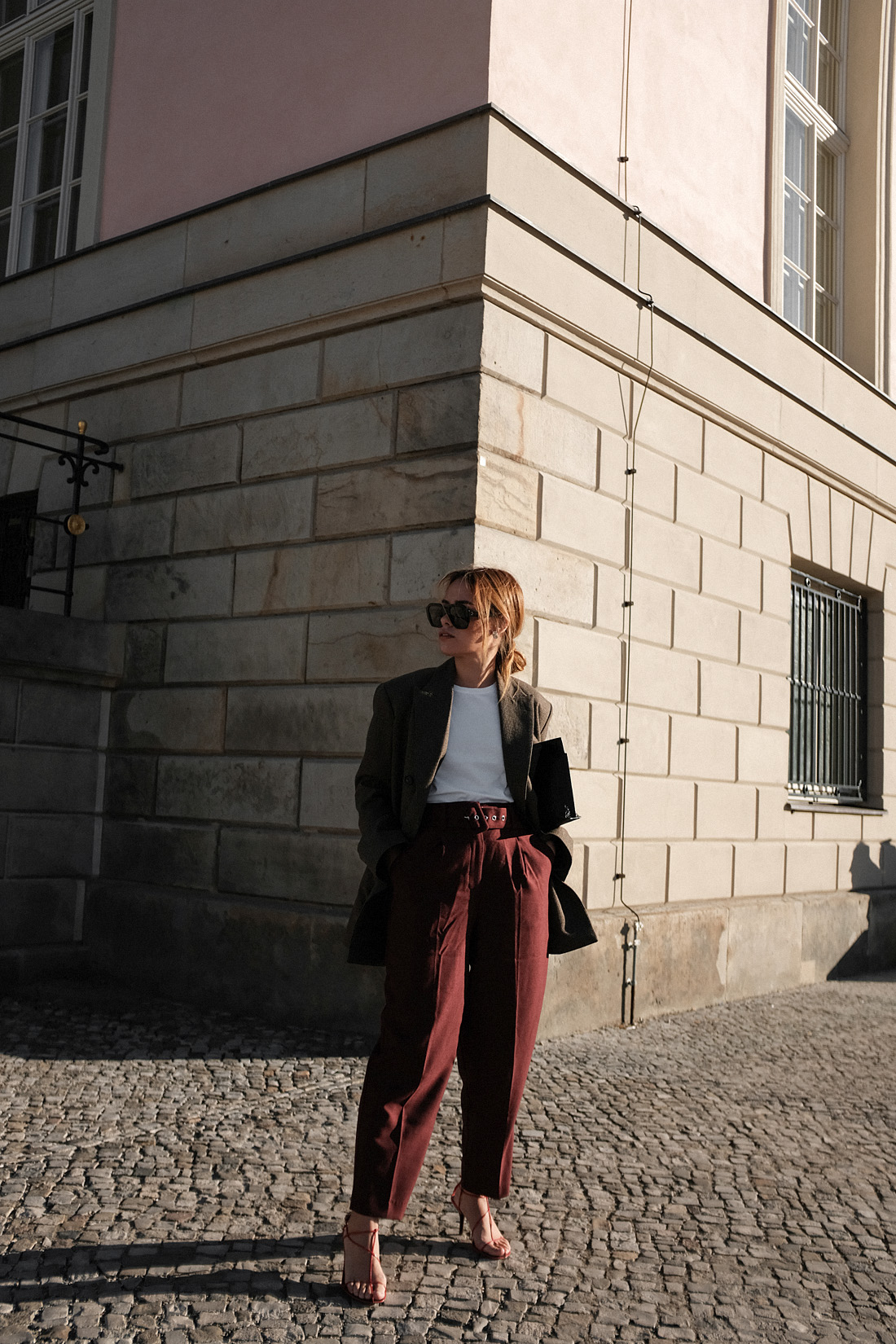 Burgundy pants – Edited the Label. White t-shirt – & Other Stories. Oversized blazer – Åland (similar here or here). Sandals – Céline. „T Pouch“ – Loewe. Sunglasses – Céline. Earrings – by teetharejade.
