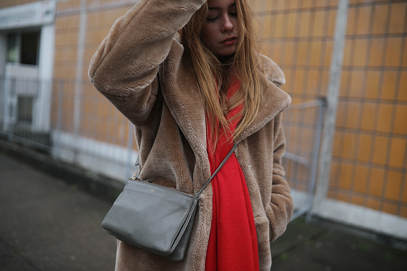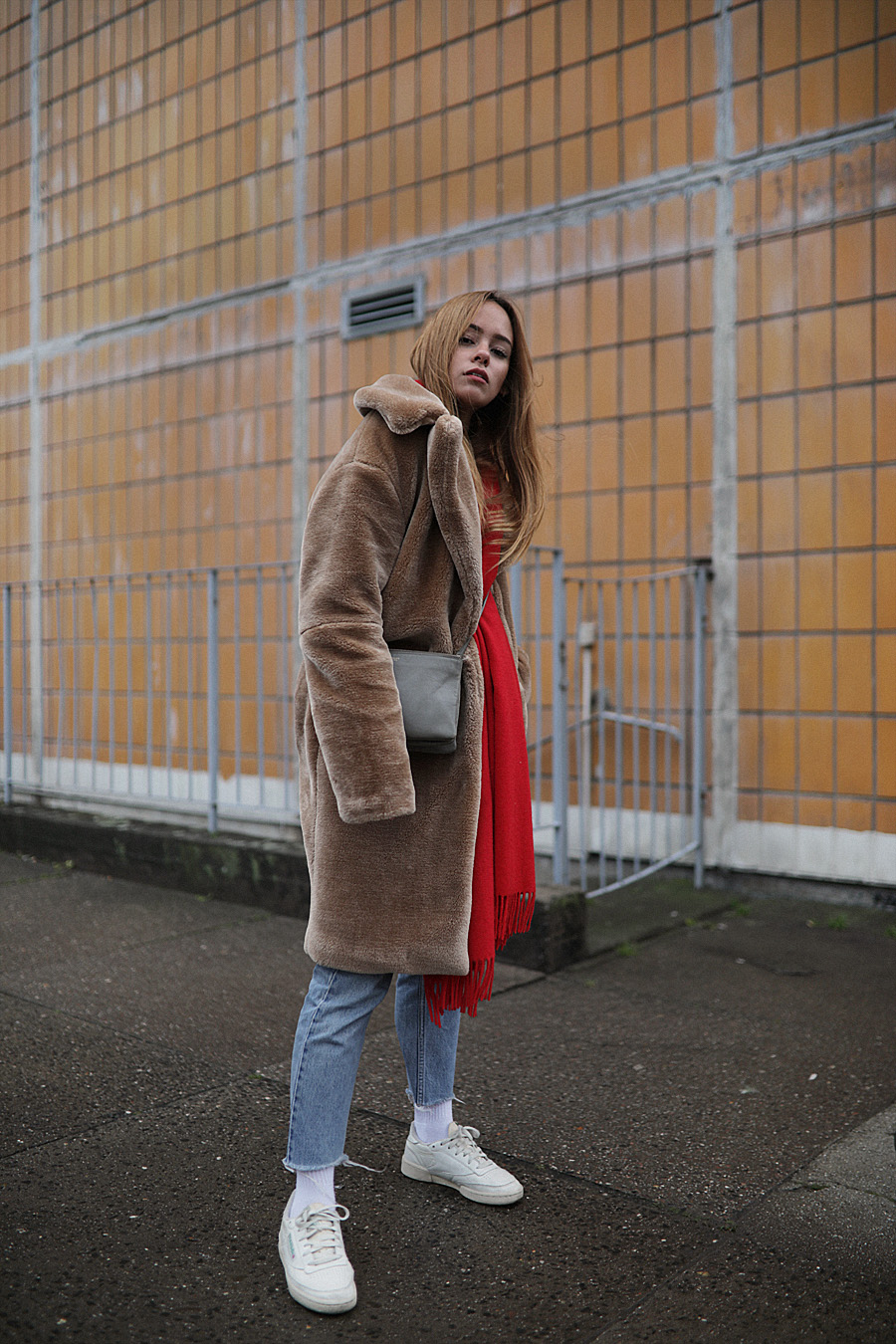 Teddy coat – Edited the Label. Red scarf – & Other Stories. Mom jeans – Monki. Trio bag – Céline. „Club C 85 Vintage“ sneakers – Reebok.