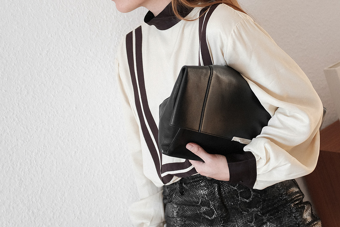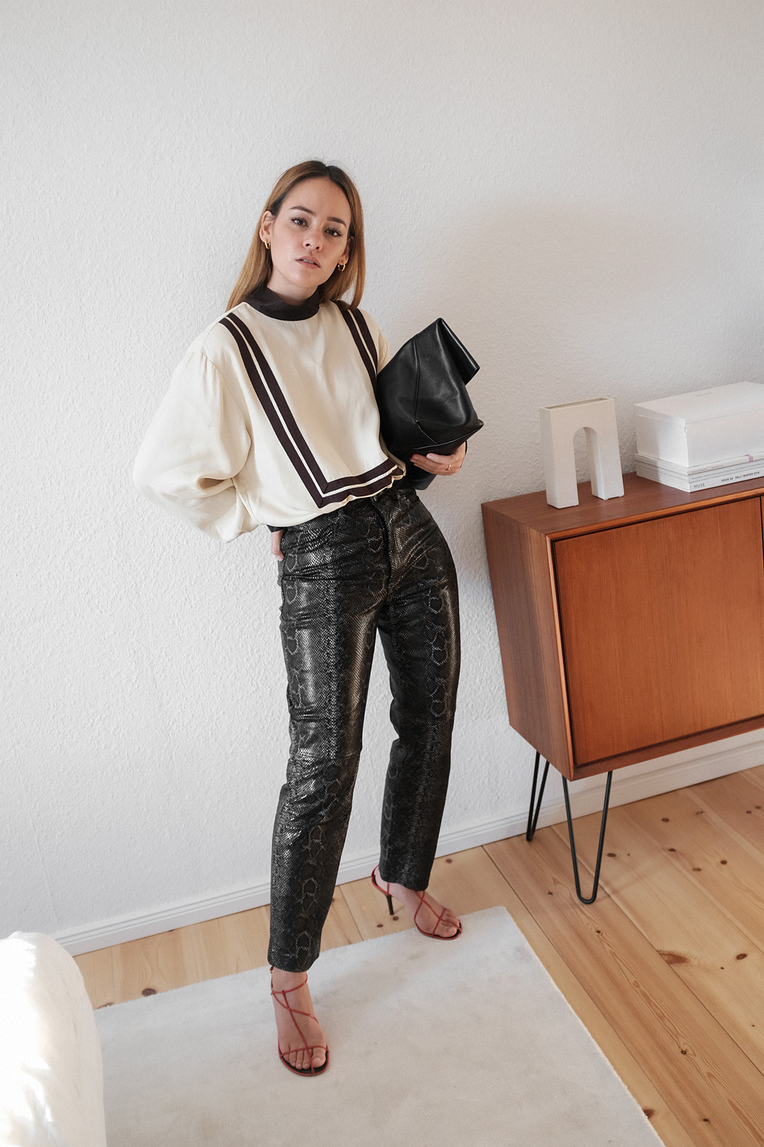 Mein Look besteht aus einer Bluse aus Satin mit Polo-Kragen und einer grafischen Borte und einer Lederhose mit Schlangenmuster-Prägung. Ich mag beides in Kombination sehr gerne, da der Kontrast den Look modern macht. Als Accessoires wählte ich eine Leder-Clutch, die aussieht wie eine Papiertüte und Barely-There-Sandals, also Sandalen mit sehr dünnen Riemen. Das Schuhwerk kann natürlich der Umgebung angepasst werden. Sollte man sich vielleicht oft draußen aufhalten, würde ich schwarze Sock-Boots wählen. Sollte es doch noch gemütlicher sein und mehr Wohnzimmer-Stimmung ausstrahlen, wären Slippers oder flache Mules sehr schön – hier gerne aus Samt! Geht es in Richtung Party und darf es gerne mehr sein? Dann wären genau diese roten Sandalen meine erste Wahl.