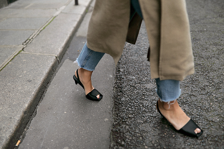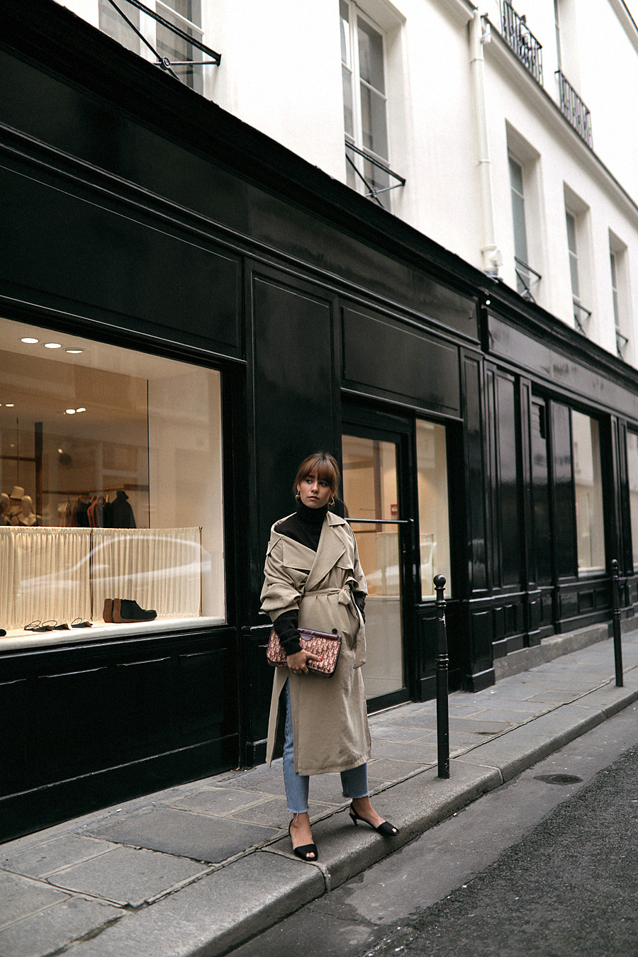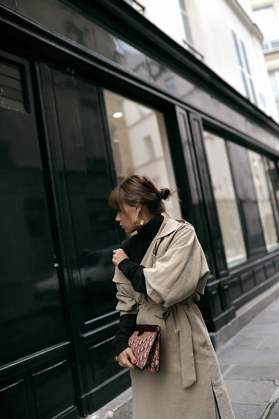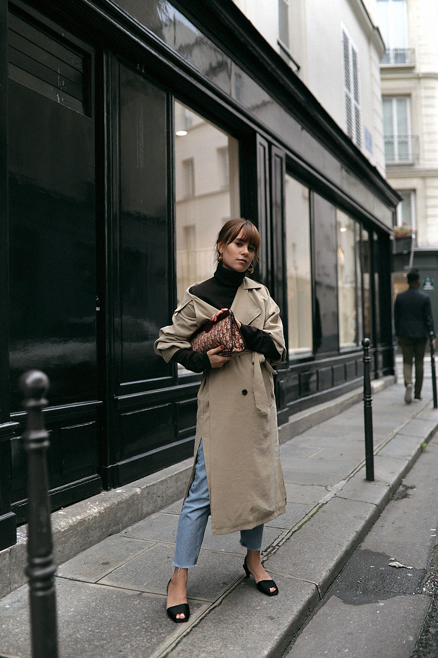 wearingBeige Trench Coat – Murmuring (similar). Cashmere Turtleneck – UZWEI. Mom Jeans – Monki. Earrings – Anissa Kermiche (similar). Satin Sandals – Balenciaga. Monogram Clutch – Dior (Vintage).