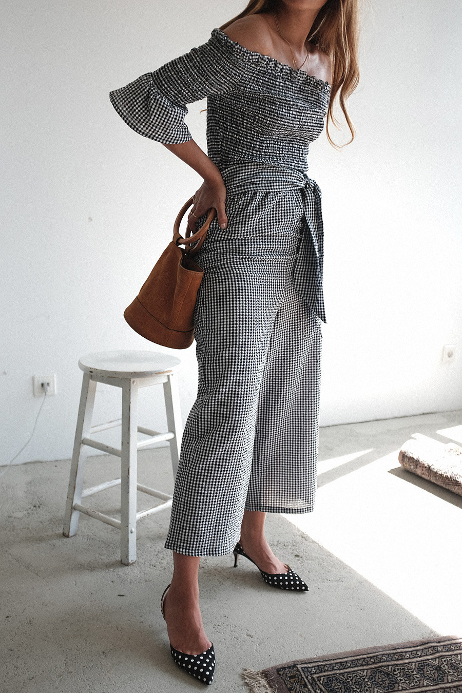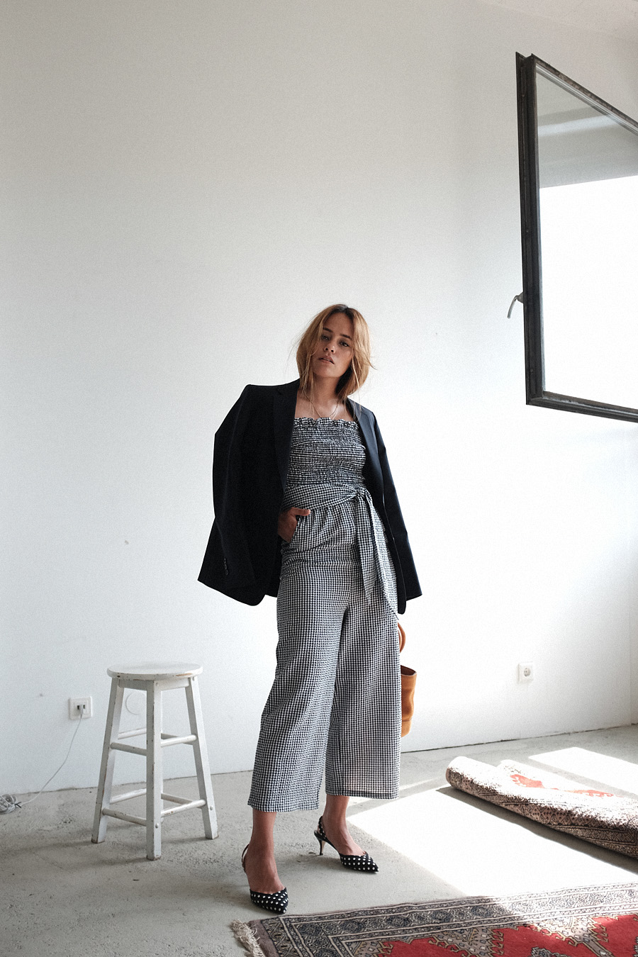„Janna“ vichy jumpsuit – Edited the Label. Wool blazer – Arket. „Bonsai“ bucket bag – Simon Miller. Polkadot slingback pumps – Paul Andrew.