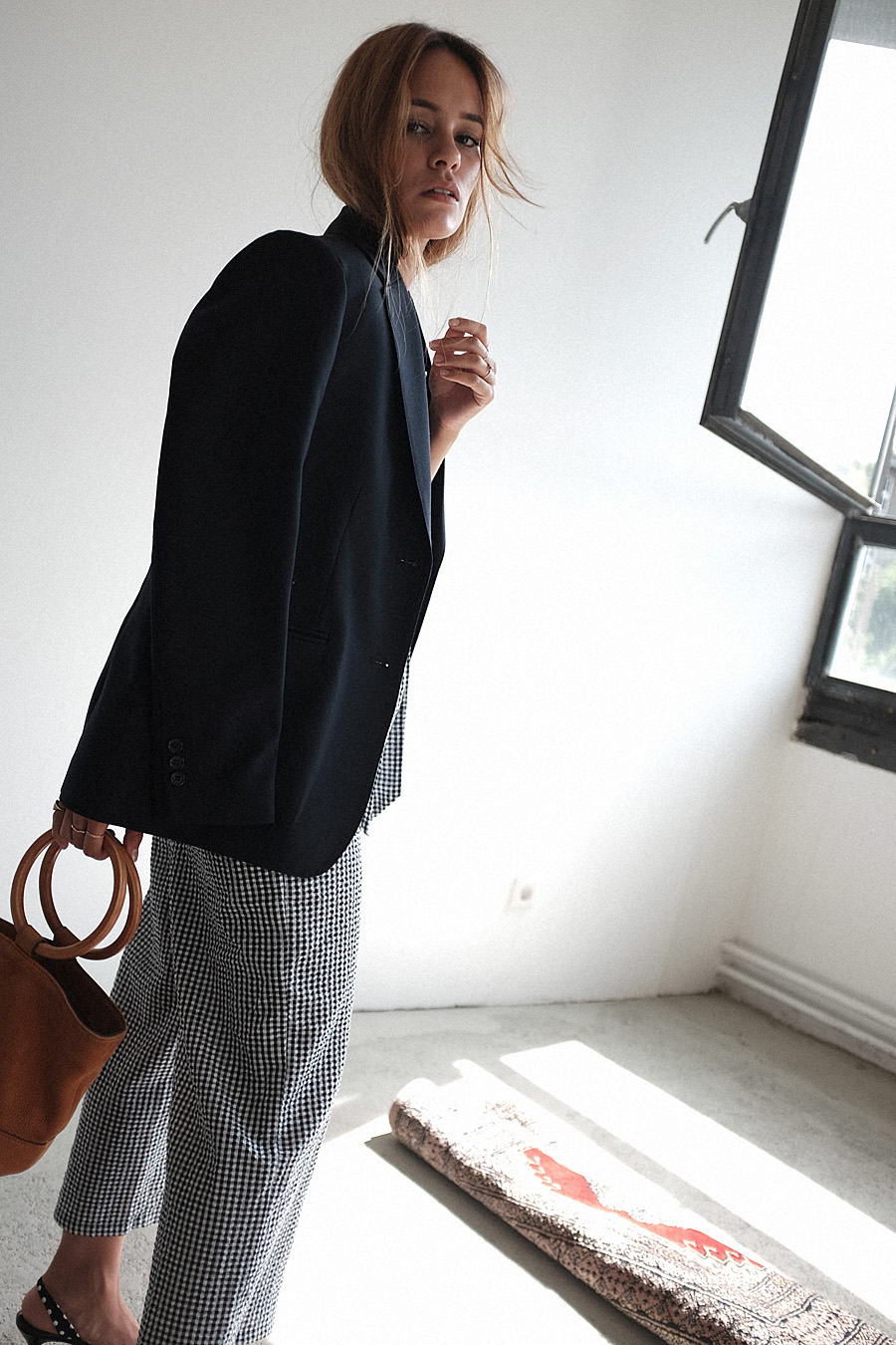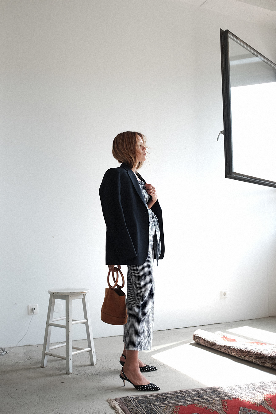 wearing„Janna“ vichy jumpsuit – Edited the Label. Wool blazer – Arket. „Bonsai“ bucket bag – Simon Miller. Polkadot slingback pumps – Paul Andrew.
