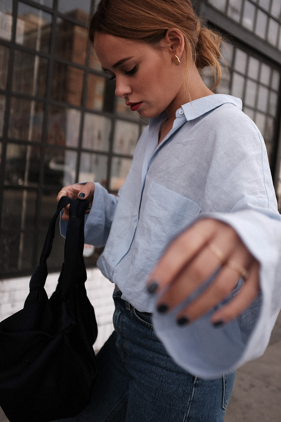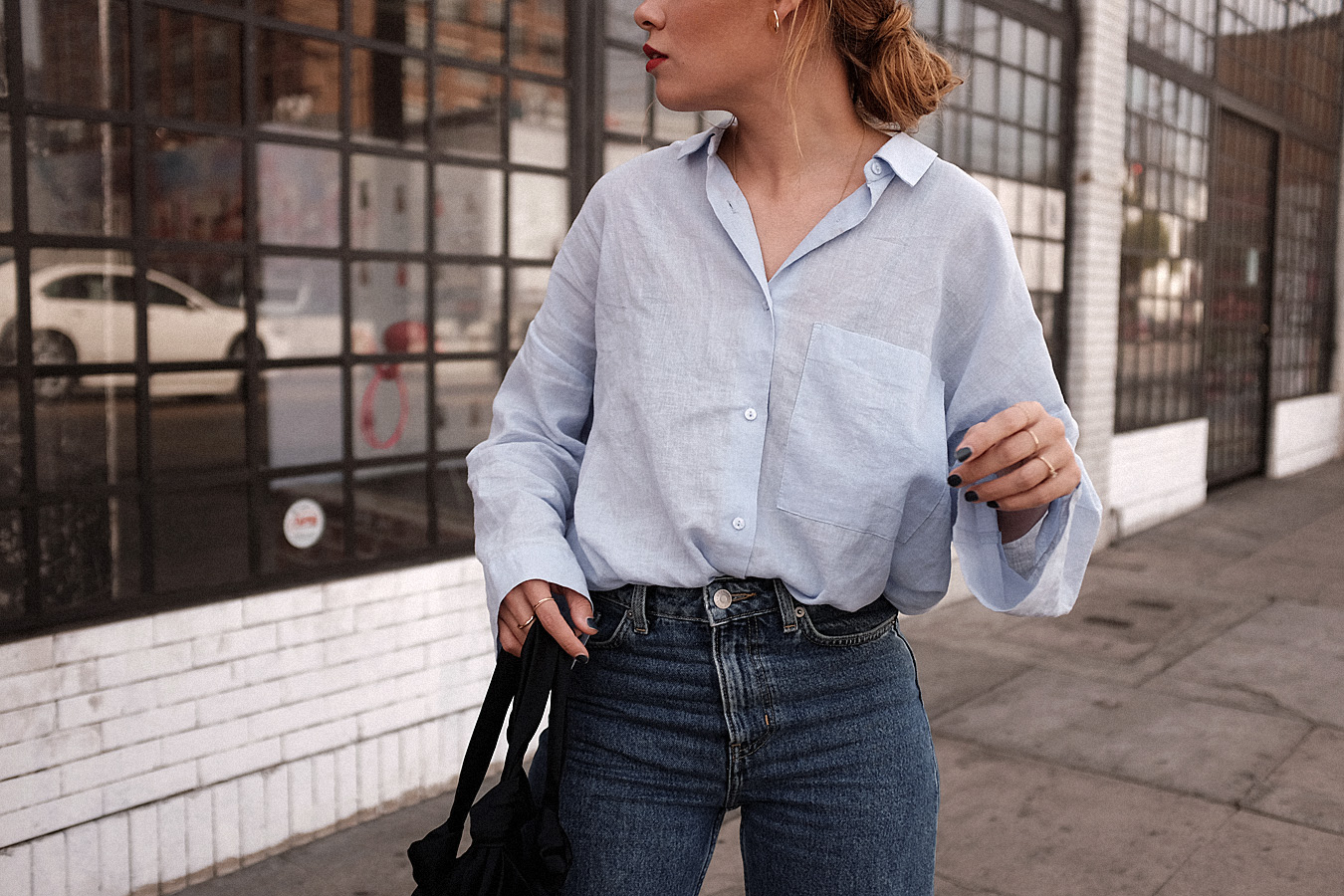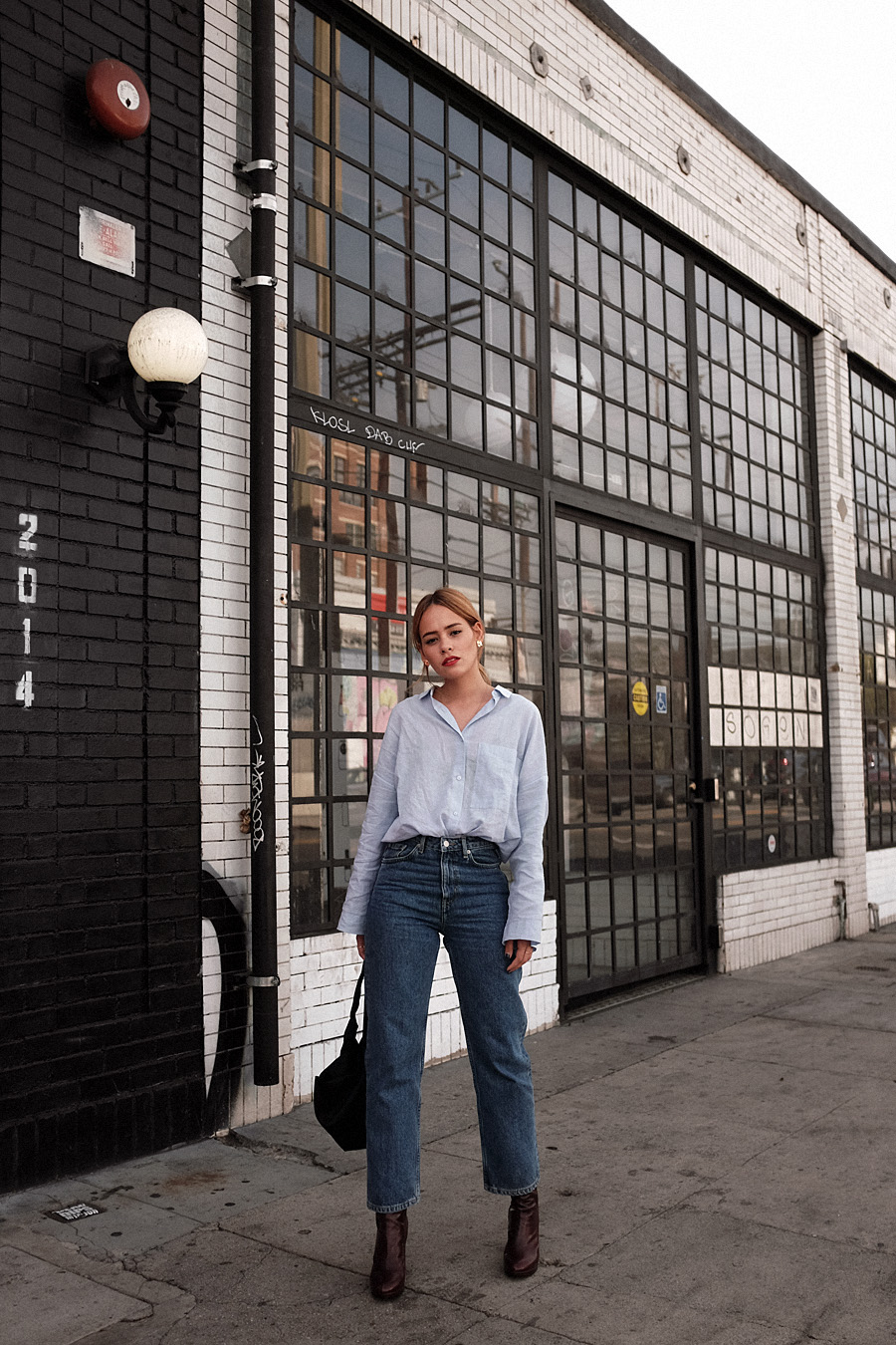 Eine Denim mit weiten Hosenbeinen, dazu runde Lederstiefel mit Blockabsatz – Für mich hat diese Kombination diesen gewissen Vintage Vibe, der perfekt zu Los Angeles passt. Ich kann nicht sagen, ob sie eher nach 60s oder 70s aussehen, aber irgendwie wirkt es so, als hätte ich die Teile bei einem hippen Vintage Store gekauft. Dabei sind sowohl die Jeans als auch die Boots ganz aktuell von Weekday und von Mai Più Senza. Die weiten Ärmel der Bluse unterstreichen das auch nochmal. Wer sich nichts unter dem L.A. Vintage Look vorstellen kann, dem kann ich den YouTube-Channel von Rachel Nquyen ans Herz legen. Dort gibt es Beauty- und Fashion-Videos, als auch Daily Vlogs, alle mit einem – ich sage mal – artsy-Touch.