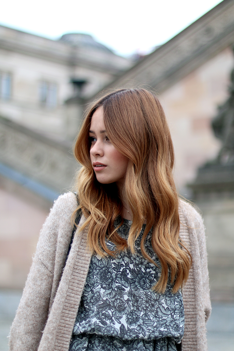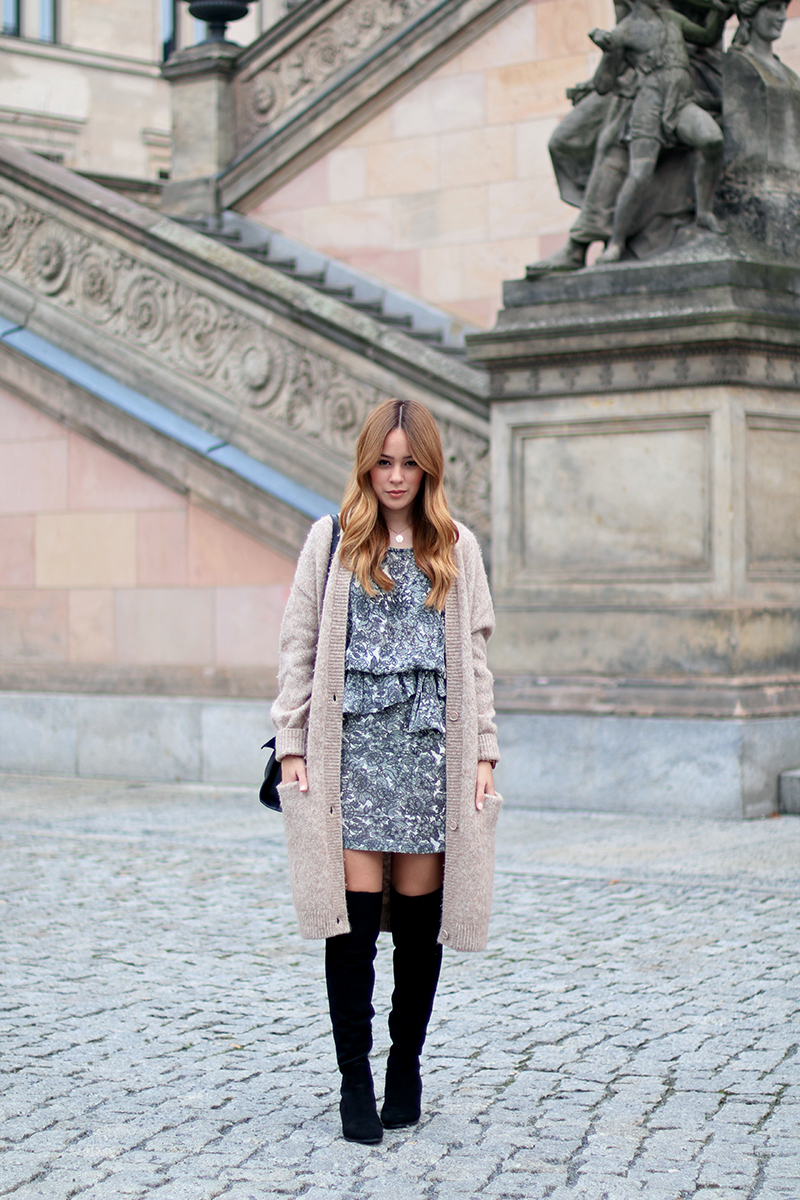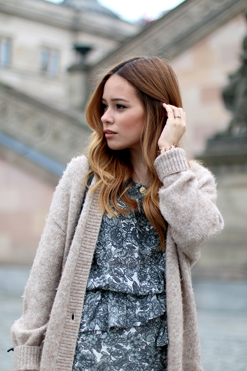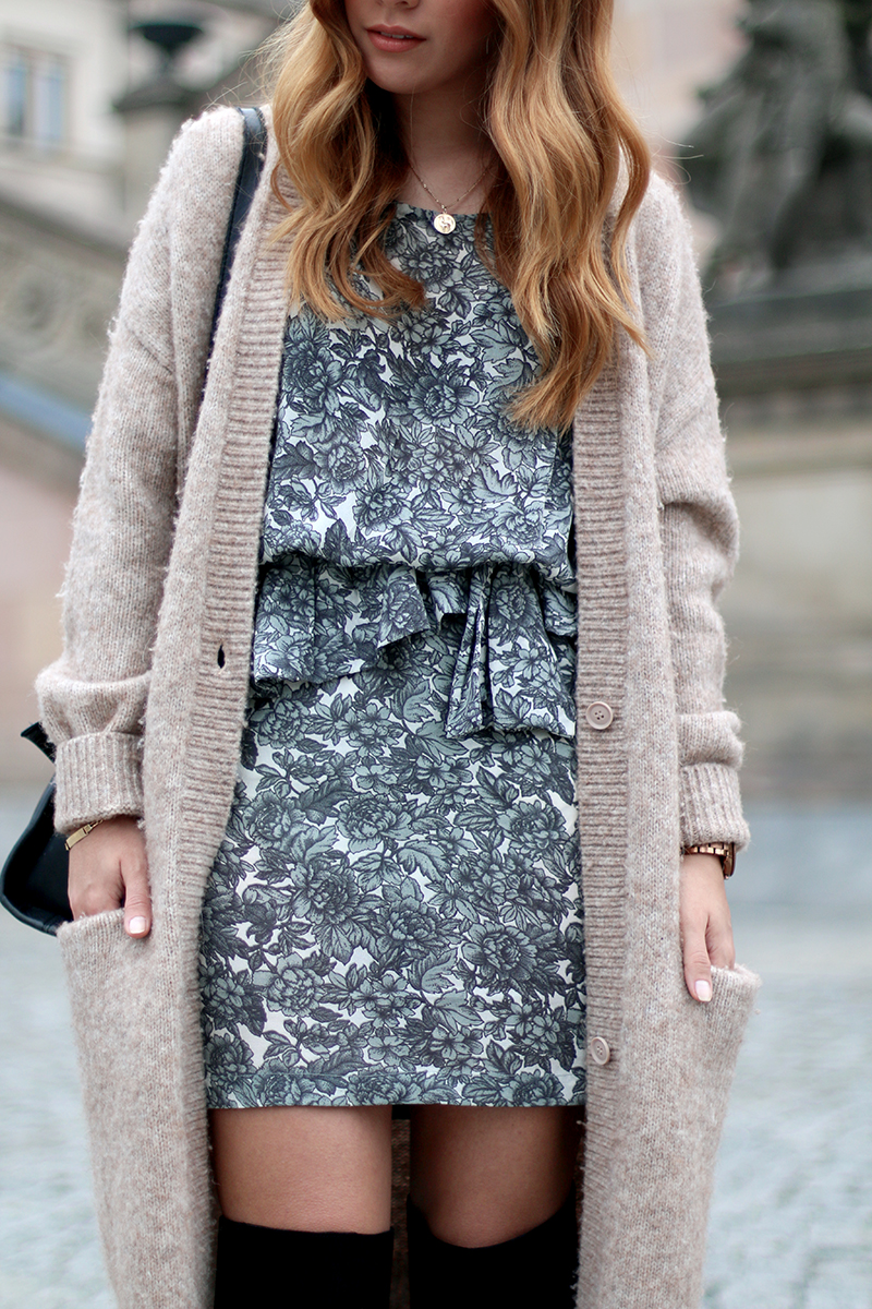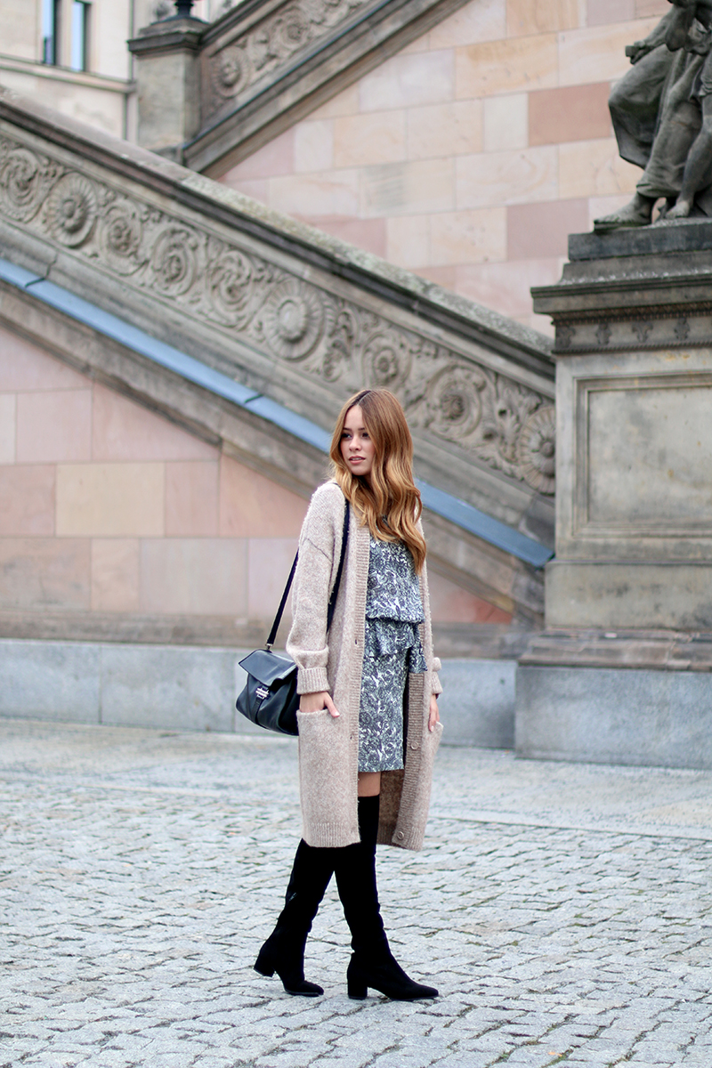 Das Kleid von Ganni ist durch das graue Blumenmuster wintertauglich und kombiniert zu Overknees und einem langen Woll-Cardigan auch für niedrigere Temperaturen geeignet. Ich mag Strumpfhosen nämlich überhaupt nicht! Und so lange man nicht einen zwei-stündigen Spaziergang in der Kälte macht, geht das völlig in Ordnung (Ich hatte natürlich noch einen Mantel dabei). Ganz wichtig: Durch den Gummibund an der Taille hat man genug Spielraum für ein Festmahl!