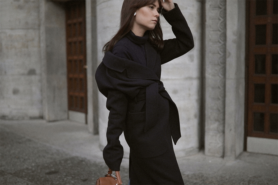 Belted wrap coat – EDITED the label. Navy Turtleneck – Oui (similar). Marianne jean 9575 – Samsøe & Samsøe (similar). Stretch boots – Mango (similar).„Puzzle“ bag – Loewe. Earrings – Teetharejade x Stilnest.