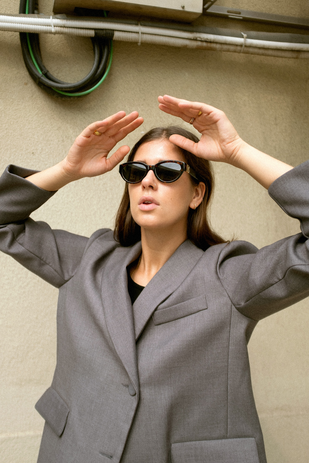 Elisa is wearingOversized grey blazer – Helder (similar). Oval sunglasses – Givenchy (similar).