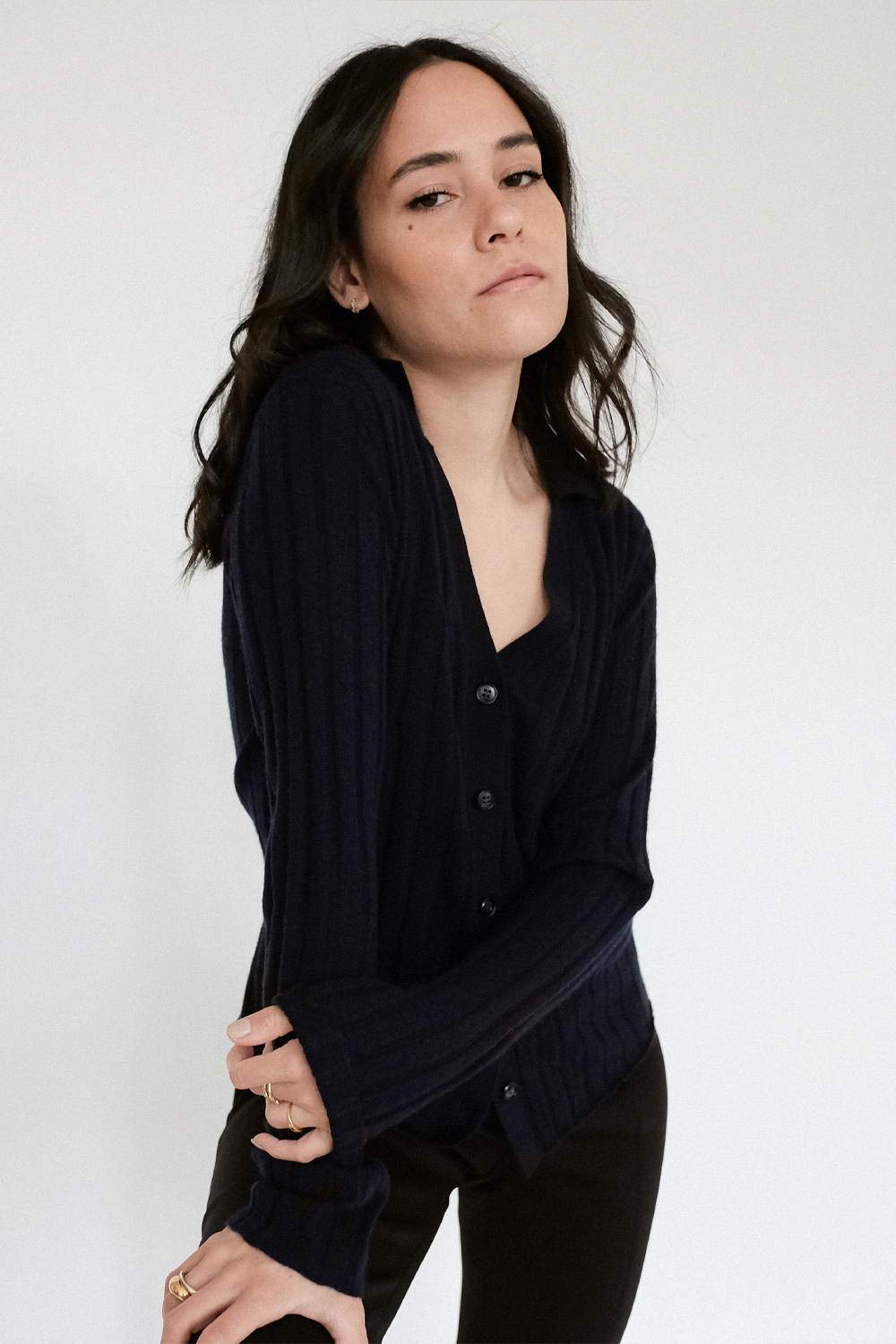 Navyblue cashmere cardigan Lisa Yang. Leggings with slit Theory (similar). Strappy sandals Aeyde.