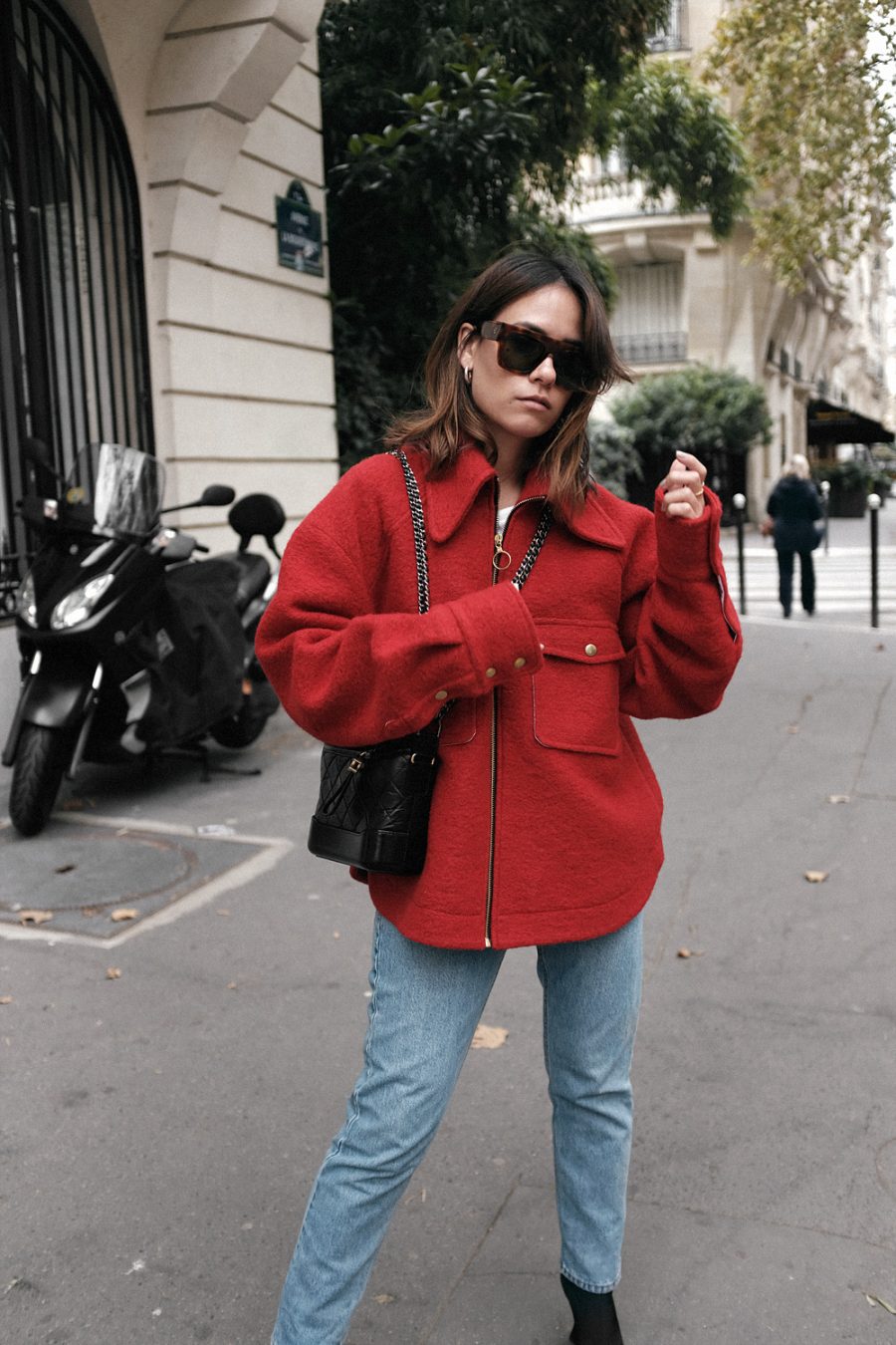 Die Farbe macht definitiv diesen Look aus. Denn im Grunde passiert hier styling-technisch nicht viel: Woll-Jacke, Jeans, Stiefeletten, Umhänge-Tasche und Sonnenbrille. Doch das grelle Rot sorgt dafür, dass man einfach hinsehen muss – ein echter Eye-Catcher eben. Dieses Outfit habe ich im Oktober in Paris getragen. Ich weiß, nicht gerade aktuell, aber dafür ist die schöne Woll-Jacke von Rika Studios* nun im Sale – 50% Rabatt sind hier nicht wenig! Außerdem eignet sie sich wunderbar als Top-Layer beim Zwiebellook im Winter, da sie sehr weit geschnitten ist.
