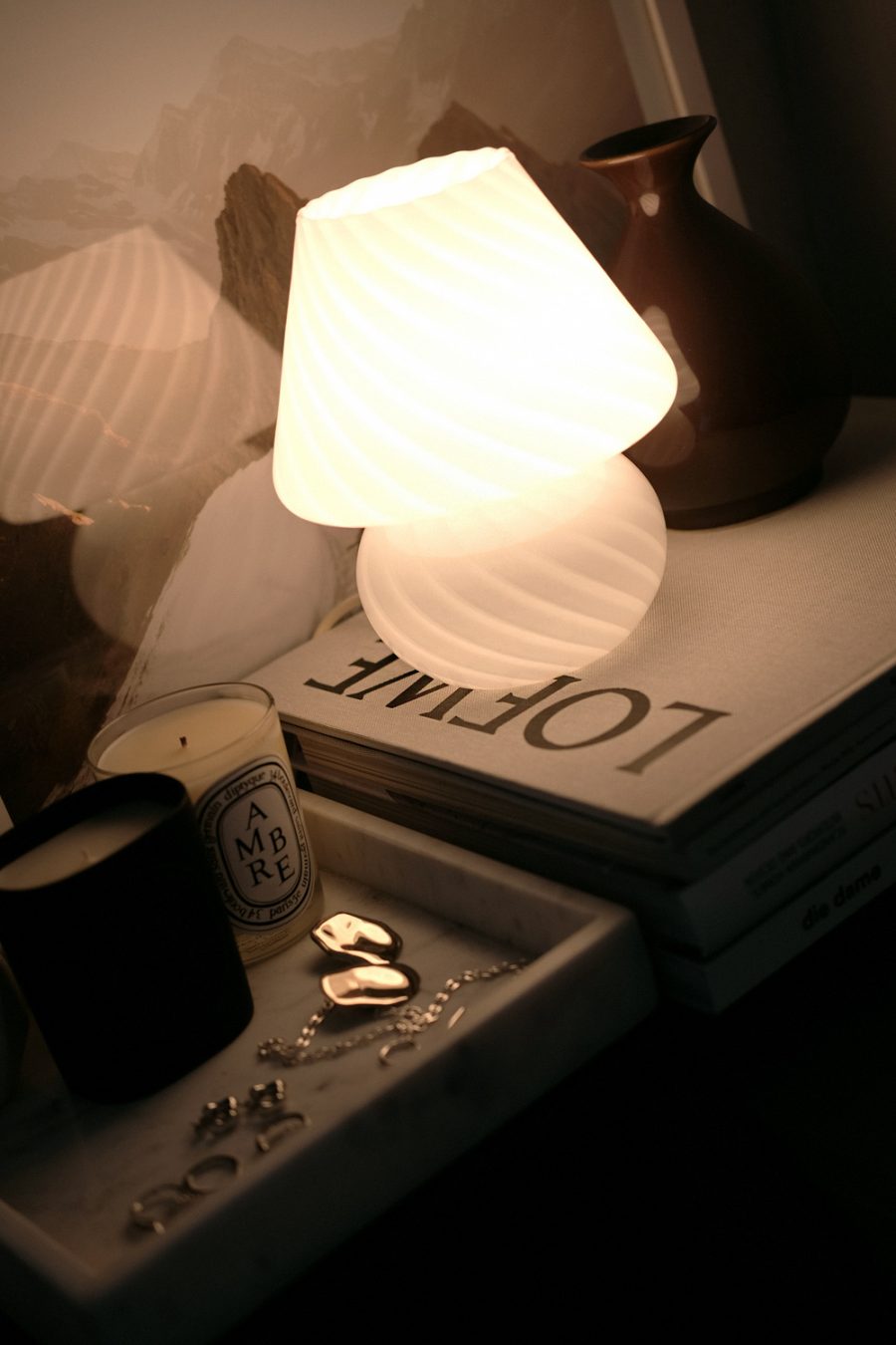 Bei mir sind zwei neue Lampen eingezogen! Diese zwei pilzähnlichen Lampen stammen aus den 70ern und sind aus Muranoglas. Ich liebe dieses glühende indirekte Licht und tagsüber sehen die Lampen aus wie kleine weiße Glasskulpturen. Zwar hatte ich mir vorgenommen, vor dem Umzug (nicht, dass dieser schon fest bevorstehen würde) keine Möbel- oder Dekoartikel zu kaufen, doch ich konnte bei diesem Angebot nicht widerstehen. Meistens werden die Lampen aus Muranoglas für um die 400 Euro verkauft, auf Etsy habe ich sie aber für etwa 130 Euro gefunden – es lohnt sich also ein wenig herumzustöbern und ggf. auch nochmal mit dem Verkäufer über die Versandkosten zu verhandeln.