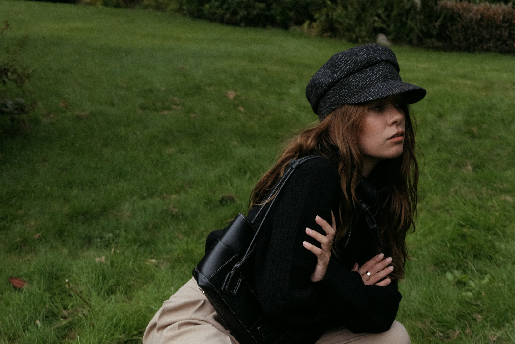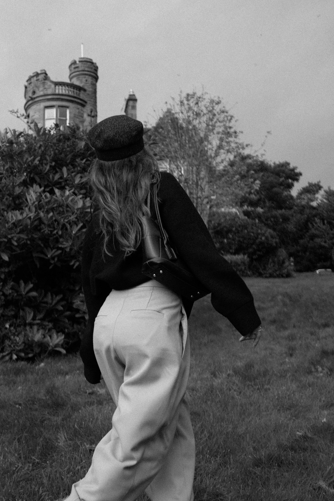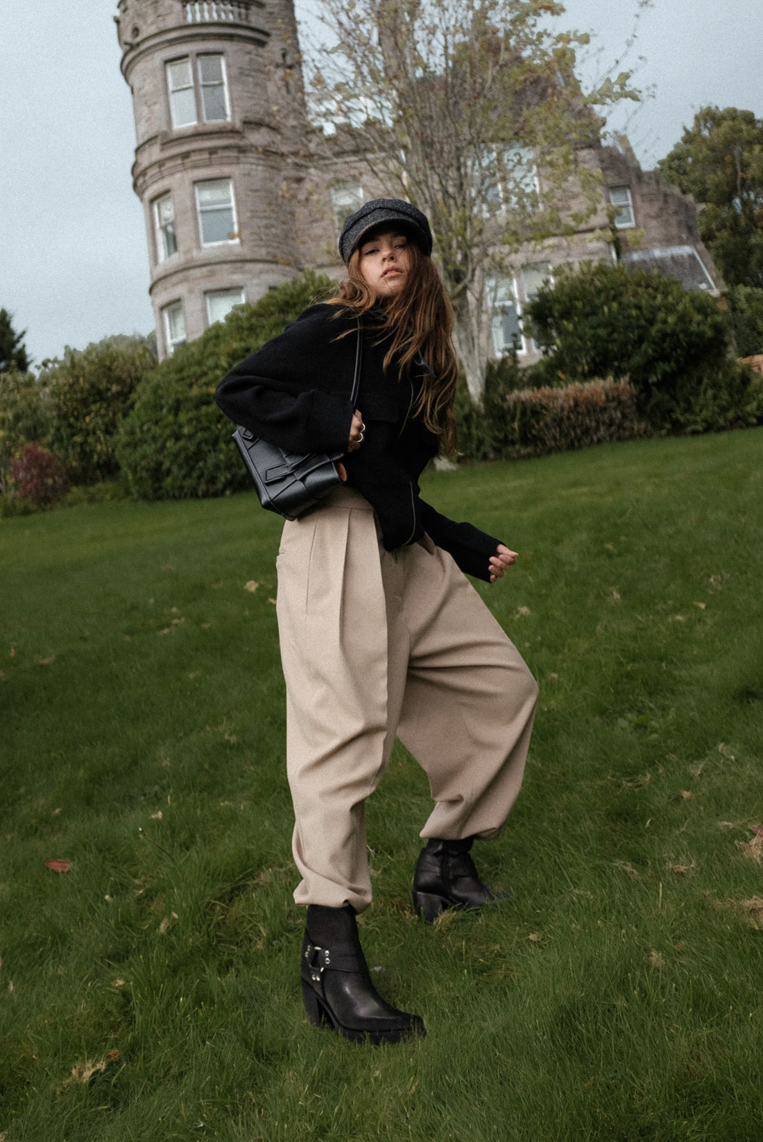 Bakerboy tweed hat & Other Stories. Leather foulard Mango. Boxy merino jacket – Arket. Pleated wool trousers (similar) bought in South Korea. ‚Elkins‘ square-toe boots (similar) Jeffrey Campbell. „Arco“ bag Bottega Veneta.
