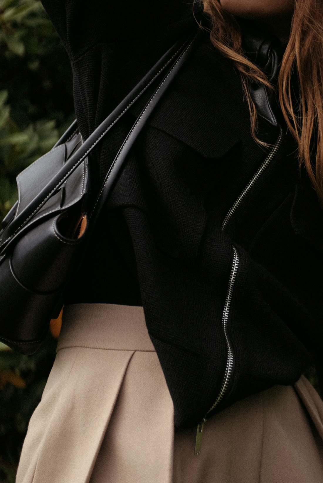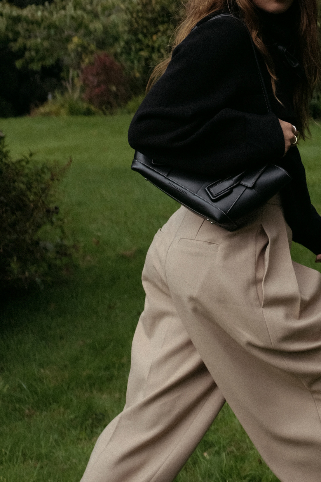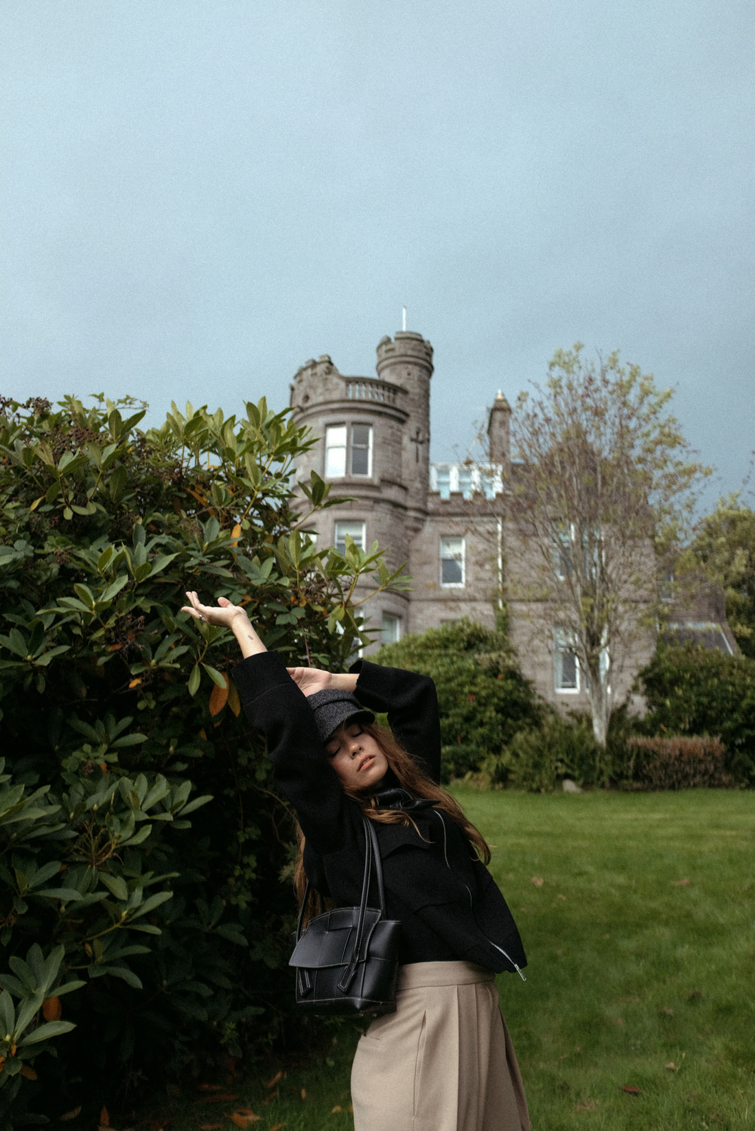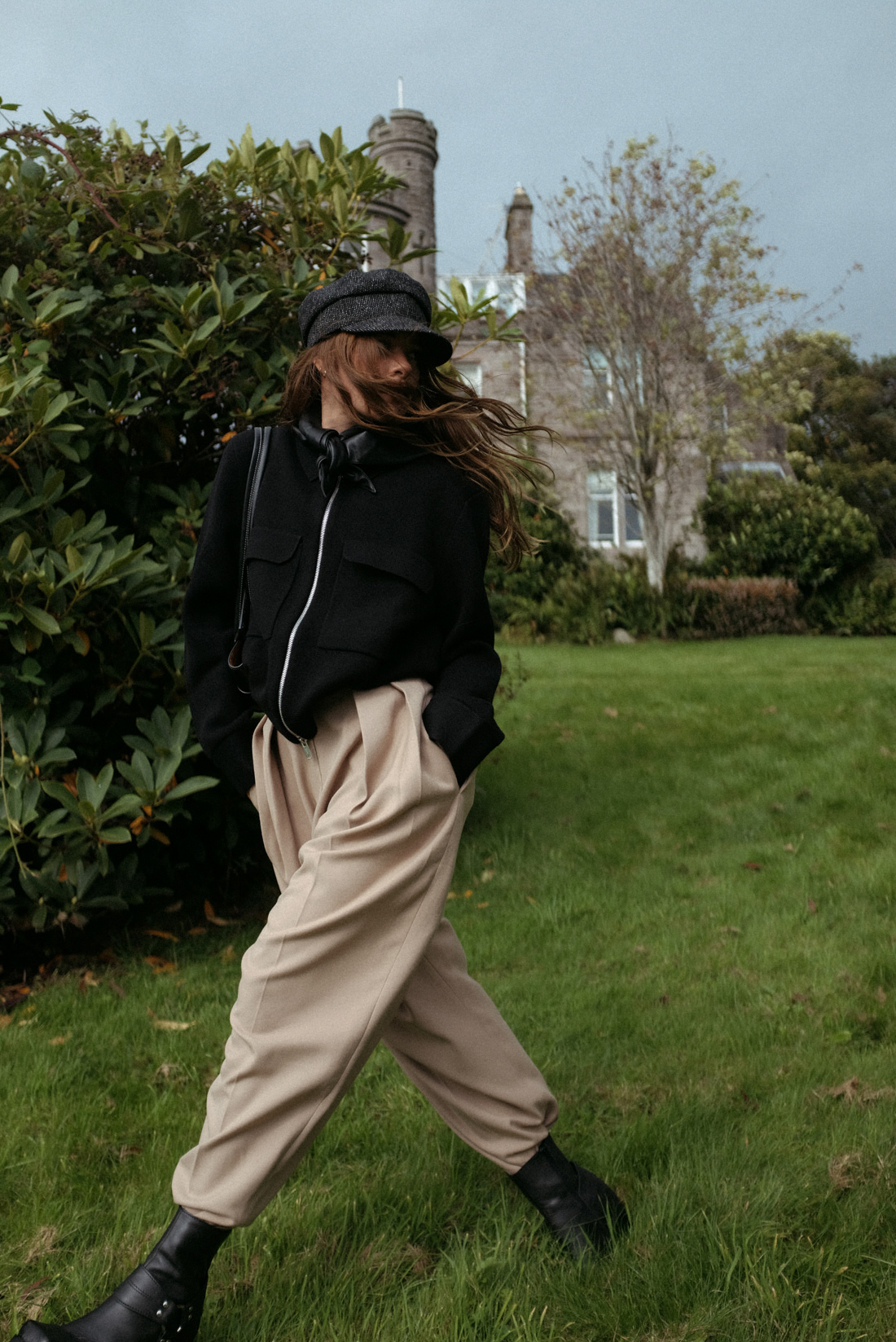 Bakerboy tweed hat & Other Stories. Leather foulard Mango. Boxy merino jacket – Arket. Pleated wool trousers (similar) bought in South Korea. ‚Elkins‘ square-toe boots (similar) Jeffrey Campbell. „Arco“ bag Bottega Veneta.