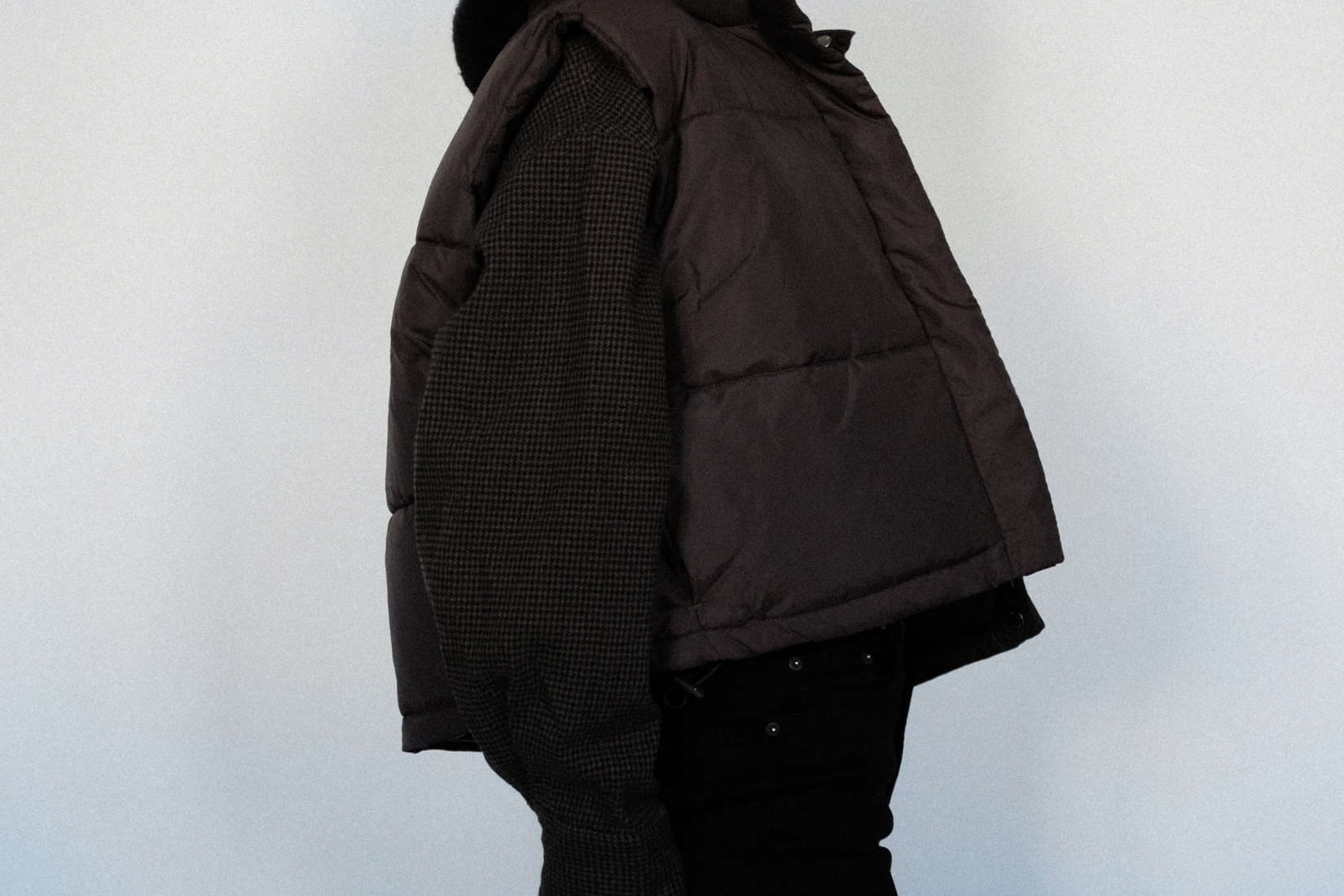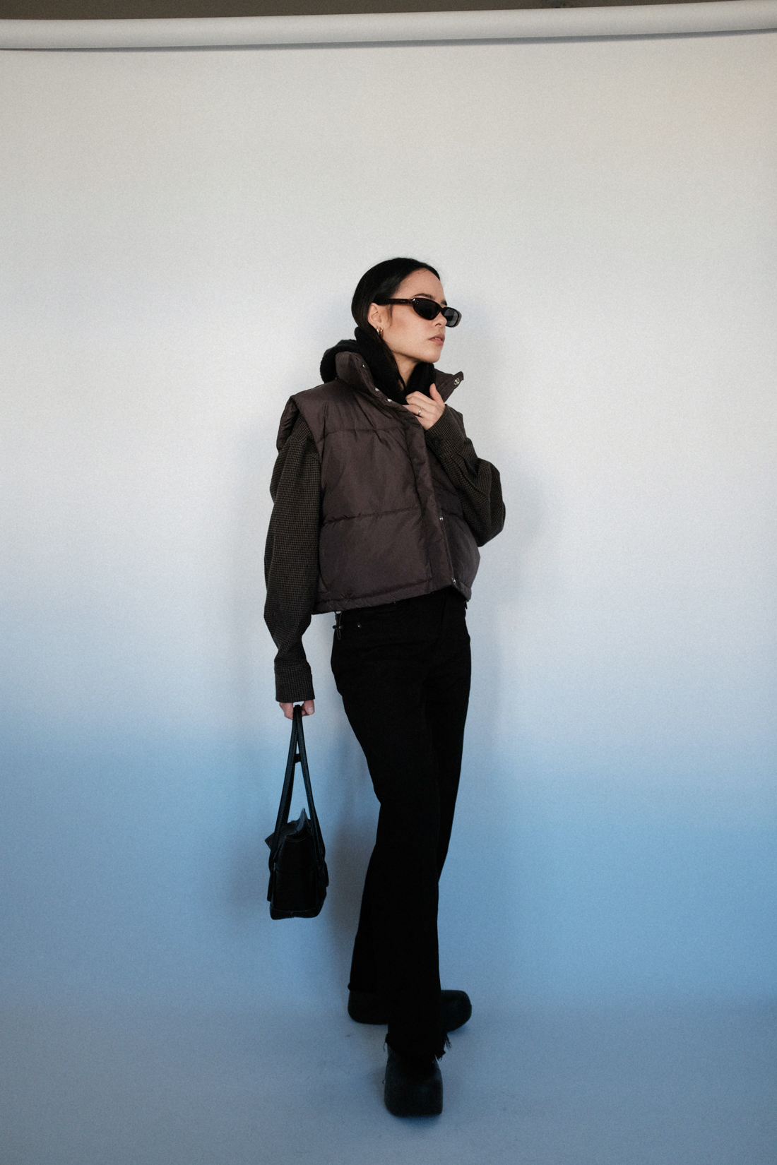 Puffer vest Weekday. Cropped flannel shirt Uniqlo. Flared black denim jeans (similar) Reformation. Sunglasses Celine. ,Arco‘ shoulder bag Bottega Veneta. ,Puddle‘ rubber boots Bottega Veneta.