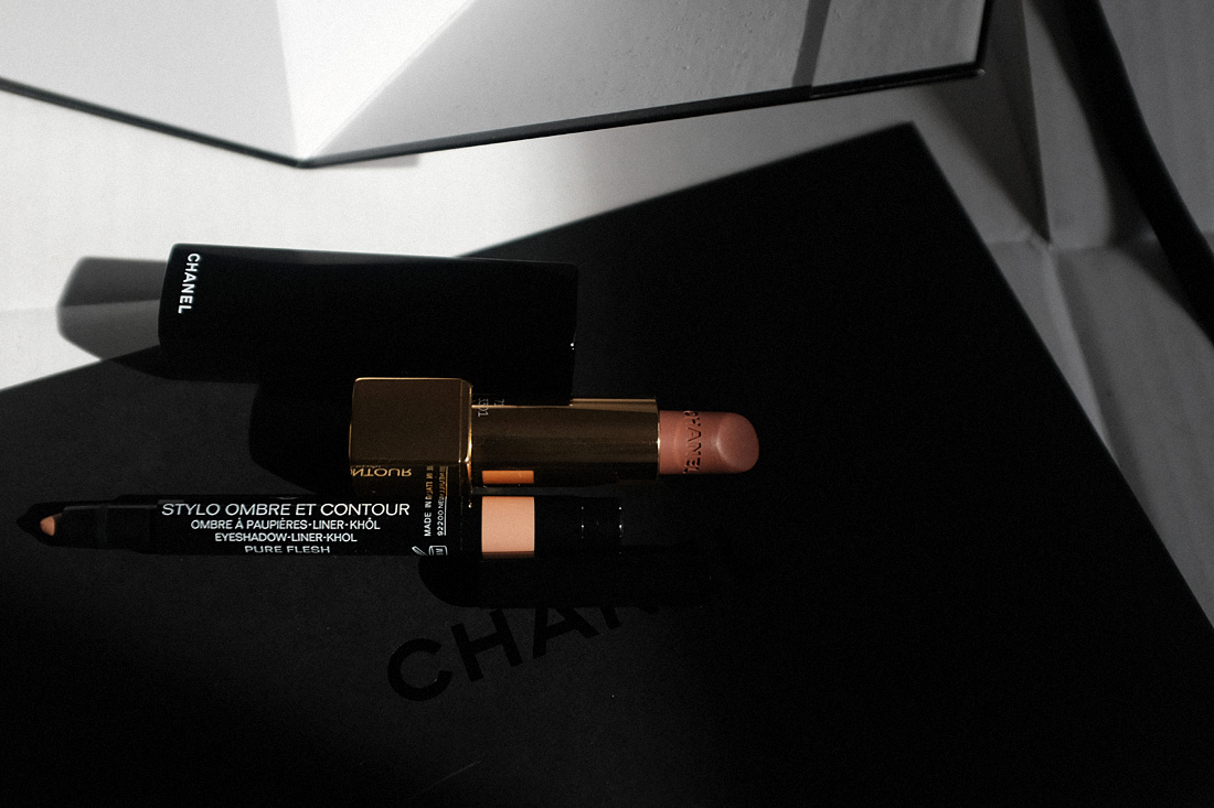 shown productsStylo Ombre et Contour eyeshadow-liner in ‚222 Pure Flesh‘ – Chanel. Ombre Premère Gloss in ‚Lunaire‘ – Chanel. Rouge Allure Velvet lipstick in ’71 Nuance‘ – Chanel. Baume Essentiel highlighter in ‚Sculpting‘ – Chanel.