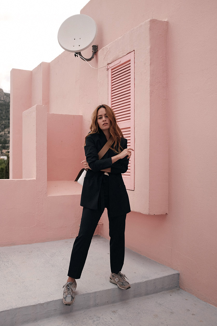 Blazer – Jake*s Collection. Tailored pants – Jake*s Collection. Silk top – Samsøe & Samsøe. Sneakers „NBW991GL“ – New Balance. „Frame“ bag – Céline. Earrings – Teetharejade x Stilnest.