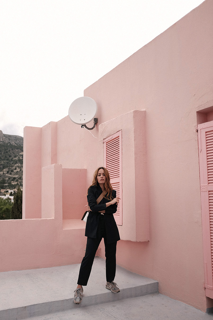 wearingBlazer – Jake*s Collection. Tailored pants – Jake*s Collection. Silk top – Samsøe & Samsøe. Sneakers „NBW991GL“ – New Balance. „Frame“ bag – Céline. Earrings – Teetharejade x Stilnest.