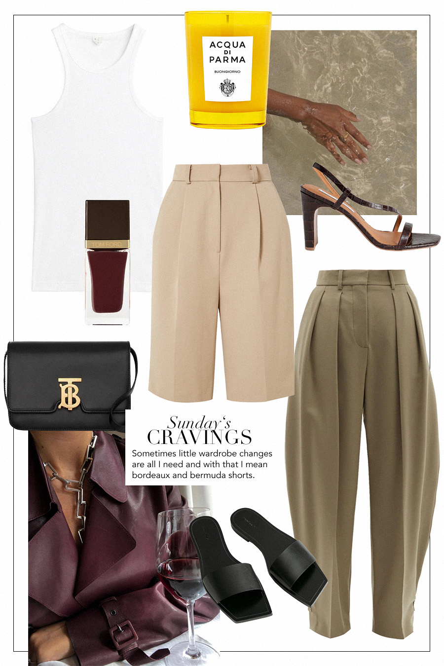 Ribbed racer top Arket. ‚Buongiorno‘ scented candle Acqua Di Parma. Nail polish in ‚Bitter‘ Tom Ford Beauty. Gabardine shorts Frankie Shop. Strappy croc heeled sandals & Other Stories. TB Monogram bag Burberry. Leather square toe slides & Other Stories. High-rise tailored trousers See By Chloé.