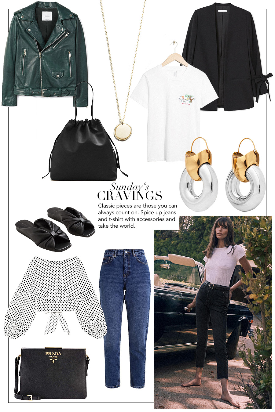 Leather Jacket – Mango. Necklace – & Other Stories. Blazer – Mango. T-Shirt – & Other Stories. Leather bag – Mango. Earrings – Ellery. Slides – Mango. Dotted Blouse – Zara (similar). Denim jeans – Topshop (similar). Saffiano bag – Prada
