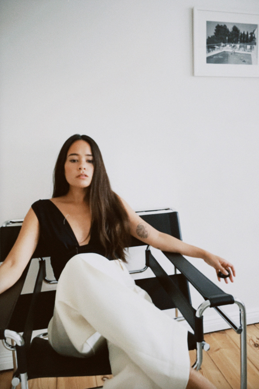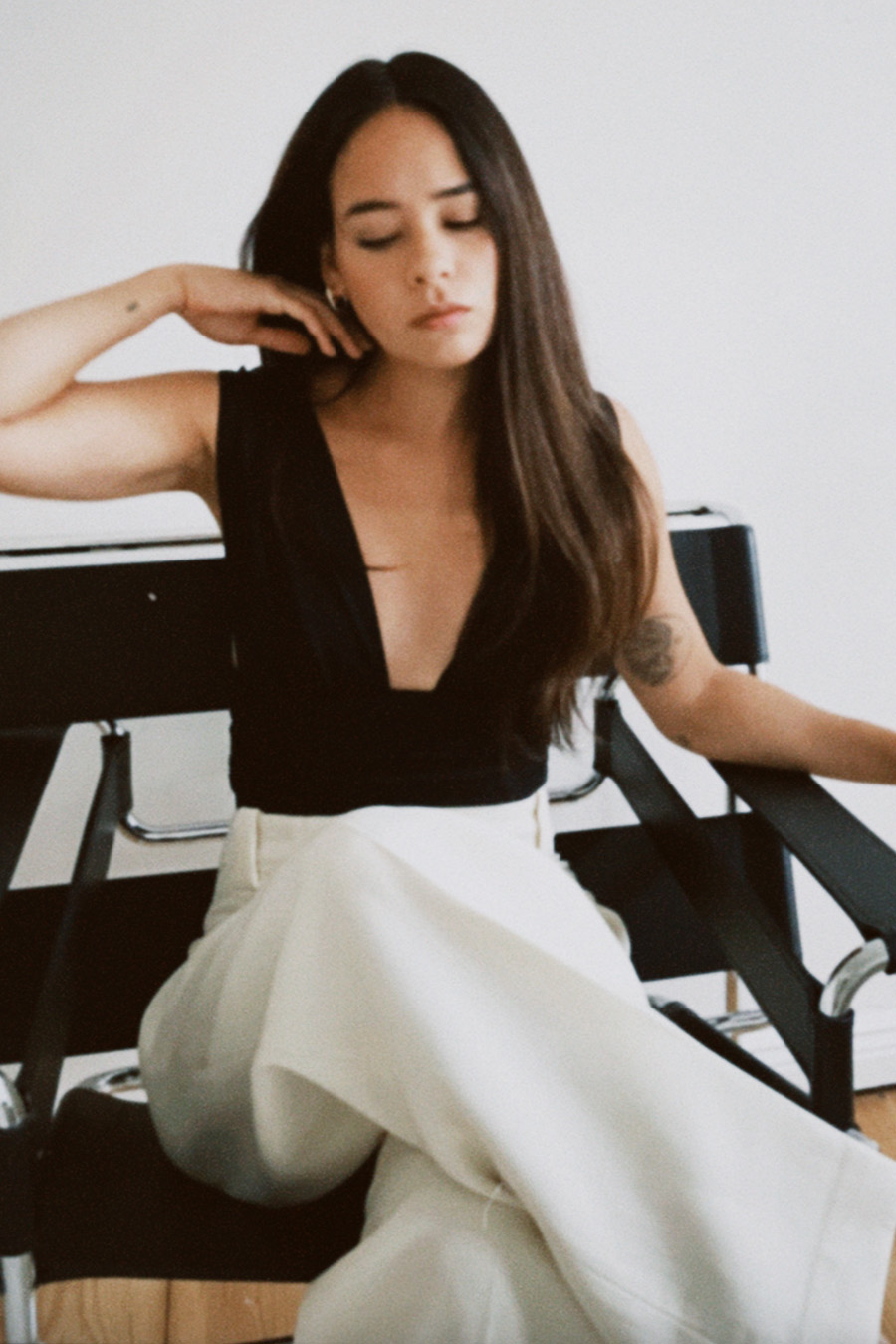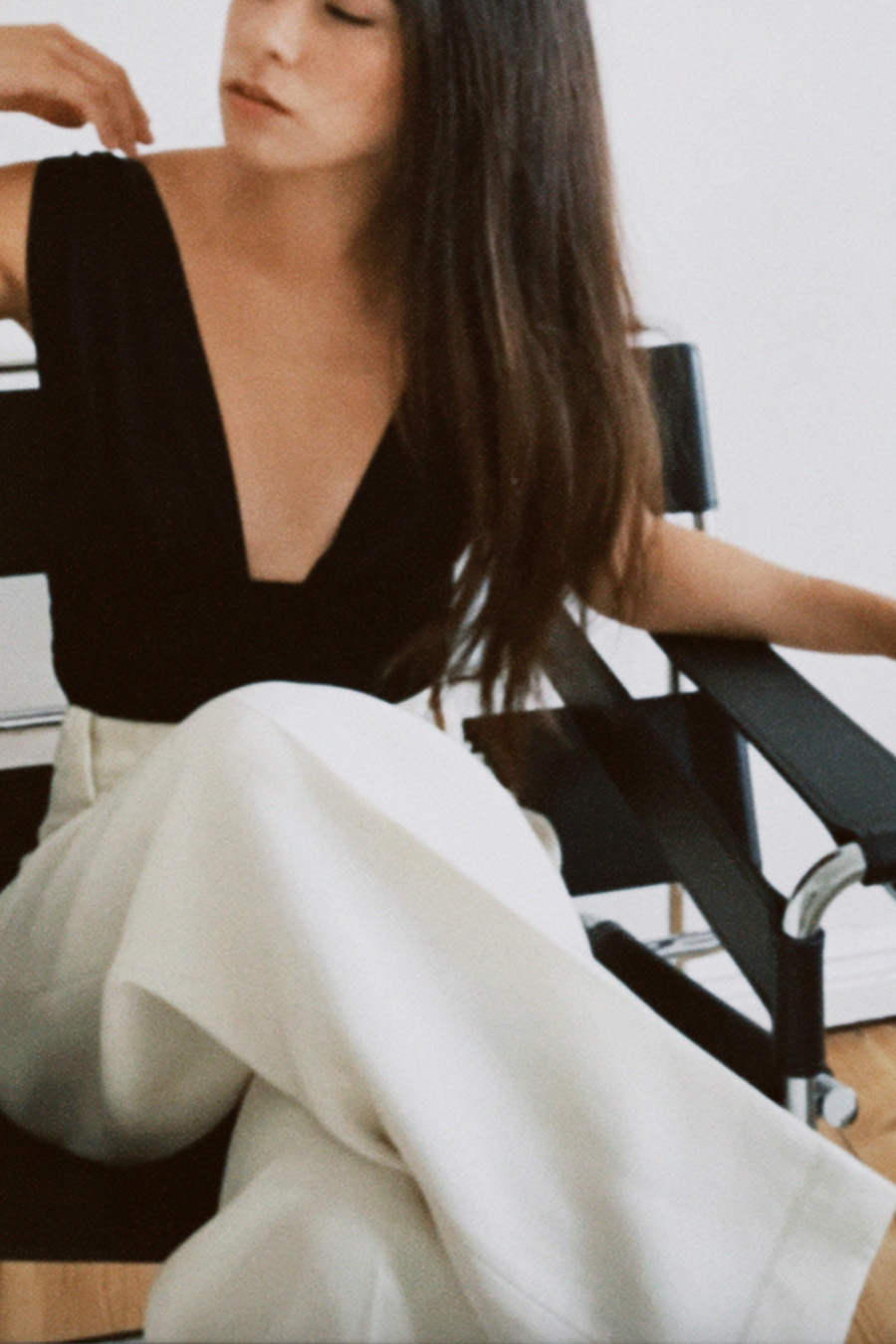 wearingBlack swimsuit worn as a top (similar) – Asos. White tailored wideleg pants (similar) – & Other Stories.