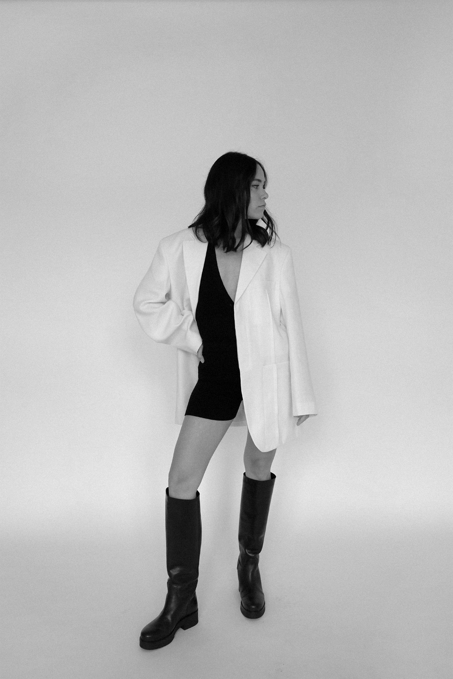 wearing„Yauco“ buttoned rib-knitted bodysuit – Jacquemus. „Le Short Arancia“ knitted shorts – Jacquemus. White linen blazer – & Other Stories. Chunky boots – Edited.
