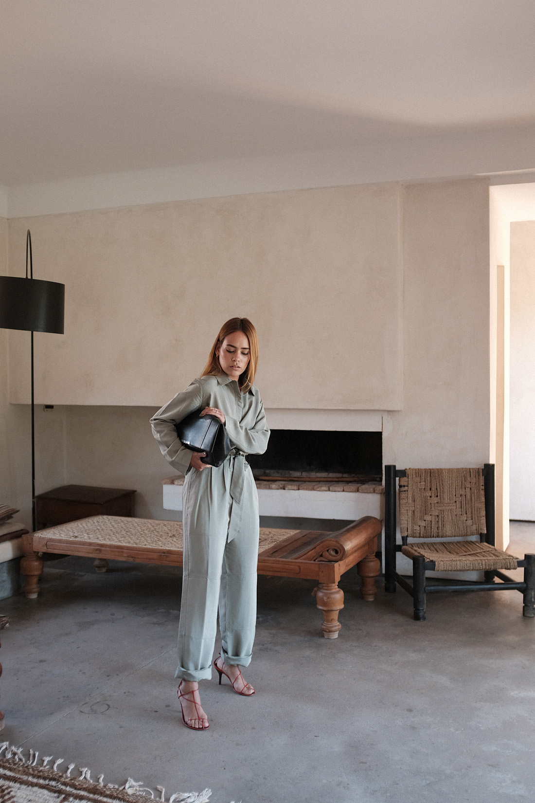 Während sich Nisi in feinen Leinenstoffen wickelt, schmeisse ich mich lieber in einen Overall. Dieser Jumpsuit ist von einem Blaumann inspiriert, ist jedoch durch den weichen Viskosestoff, den Wickelgürtel und dem blassen Khaki eine weitaus schickere Version. Damit setze ich weiter auf den Utility Trend – in Paris zeigte ich euch bereits einen Look mit einer Workwear-Jacke.