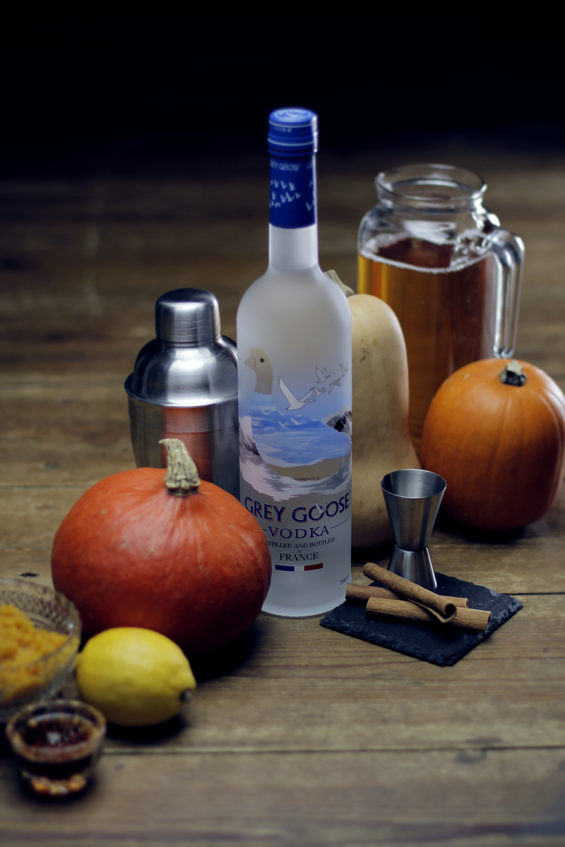 Grey Goose Wodka, klarer Apfelsaft, Ahornsirup, Kürbispüree, Zitrone, Zimt, Zimtstangen