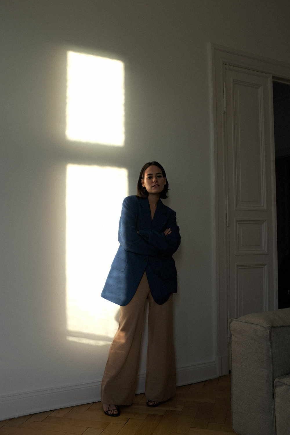 Wool & cashmere pants Edited the Label. Blue oversized blazer Arket. Strappy sandals – Céline (similar). Black blouse Totême (similar). „Small basket“ bag Bottega Veneta. Heeled Flip Flops Totême (similar).
