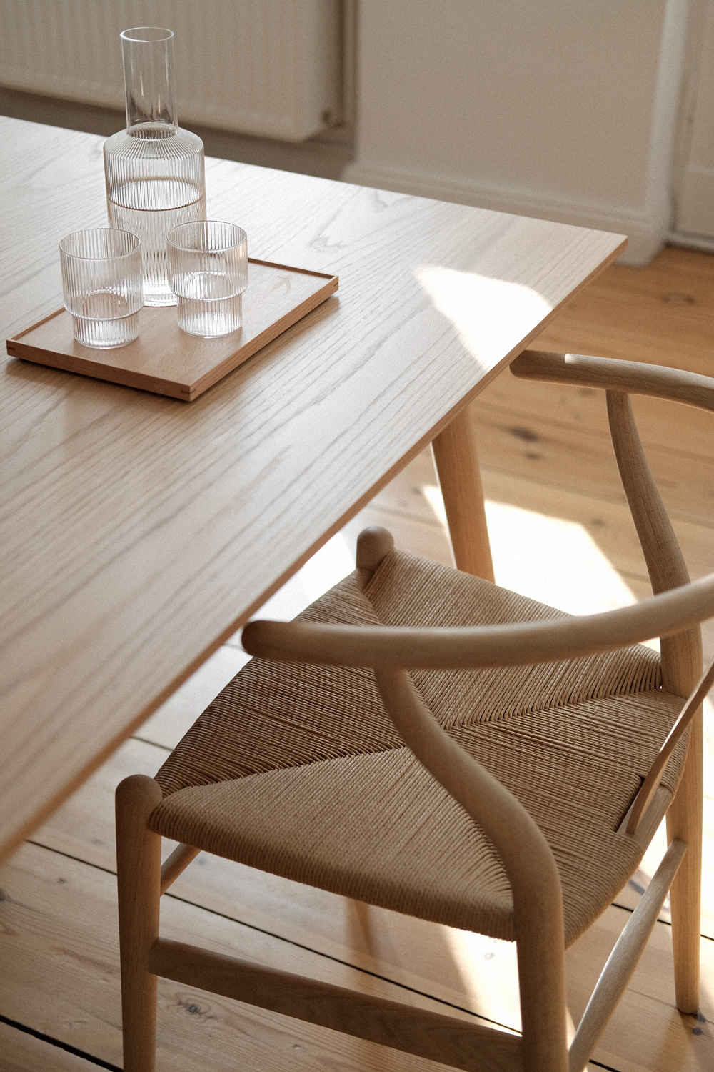 „Wishbone“ chair Hans Wegner for Carl Hansen. „In Between SK6“ table &tradition. „Ripple“ carafe Ferm Living. „Ripple“ glass set Ferm Living. Wood tray Unknown (similar).