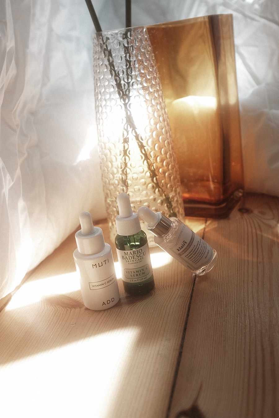 (3) Vitamin C Serum – MUTI. Dieses Serum beinhaltet zwei verschiedene Vitamin-C-Deivate, Magnesium Ascorbyl Phosphate und Ascorbyl Glucoside. Da sie erst in Verbindung mit anderen Stoffen aktiviert werden, sind sie viel stabiler als das reine Vitamin C. Sie sind wirksam, aber dabei äußerst gut verträglich. Das Vitamin C Serum von MUTI ist also bestens für die tägliche Pflege geeignet. Auch wegen der Serum-Konstistenz benutze ich es gerne in meiner Pflegeroutine für den Tag – mein liebstes Pflegeprodukt für den Glow.