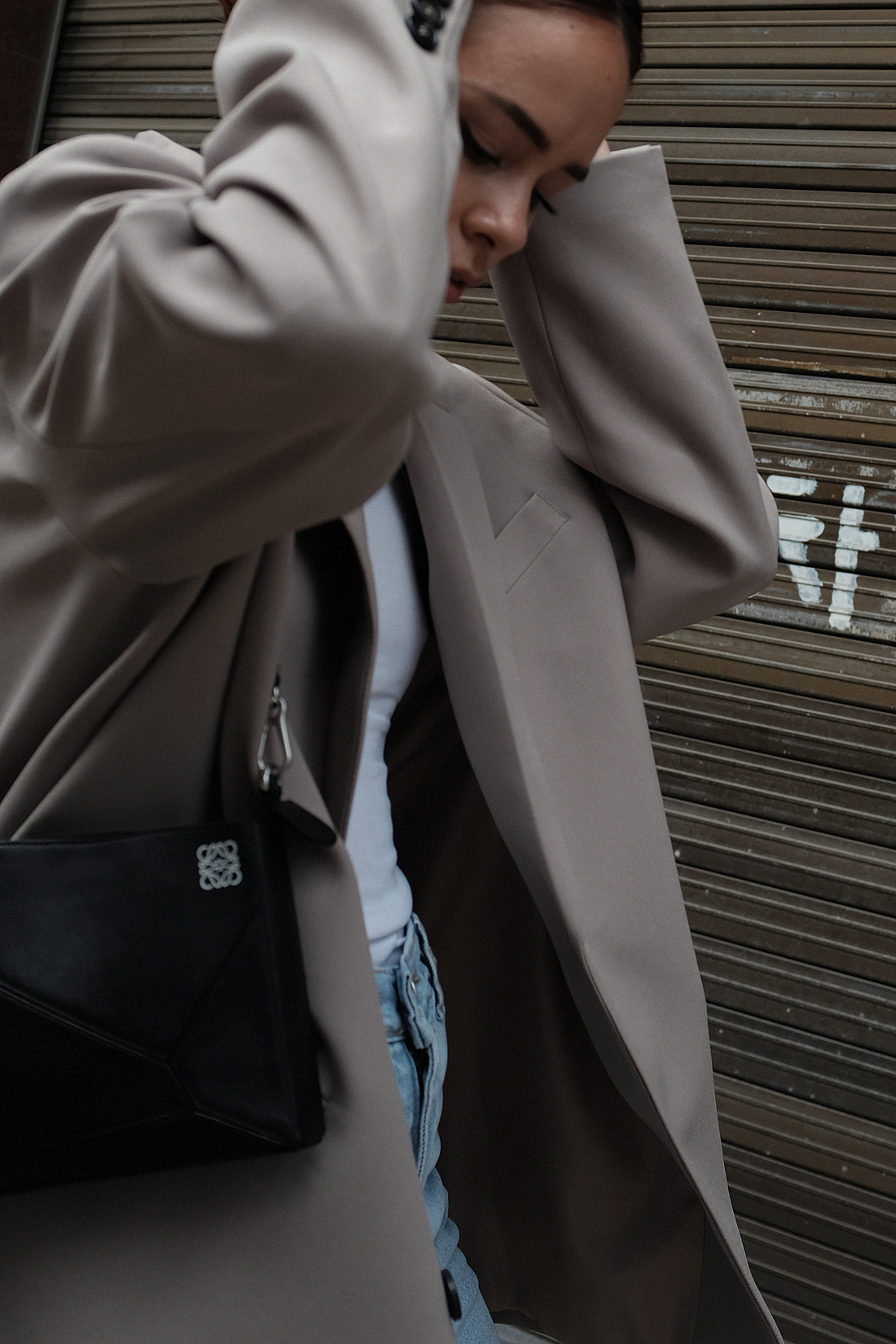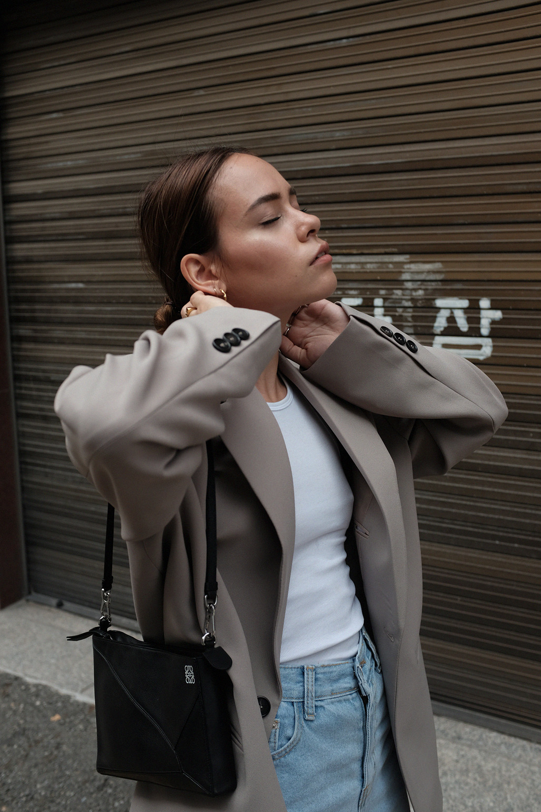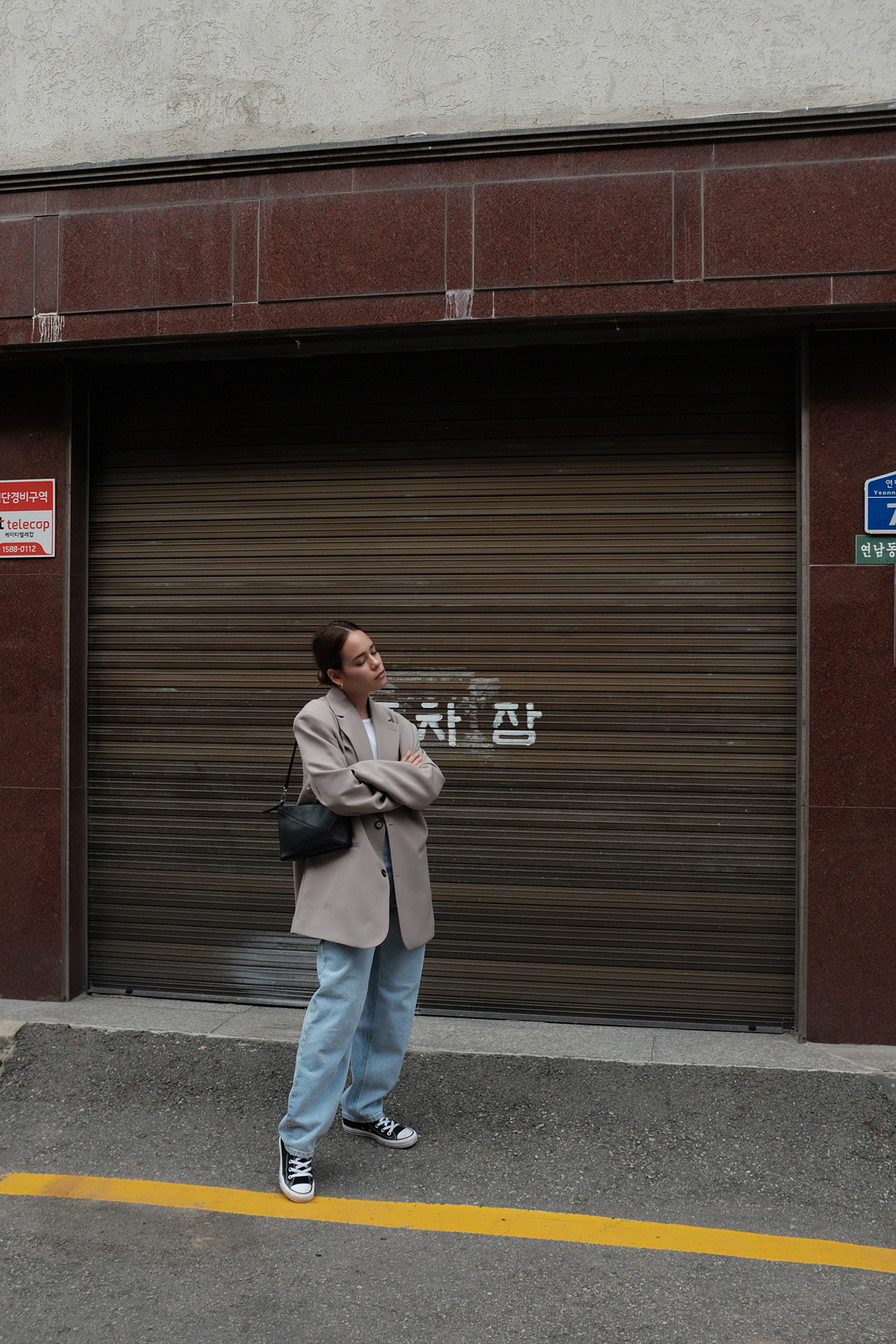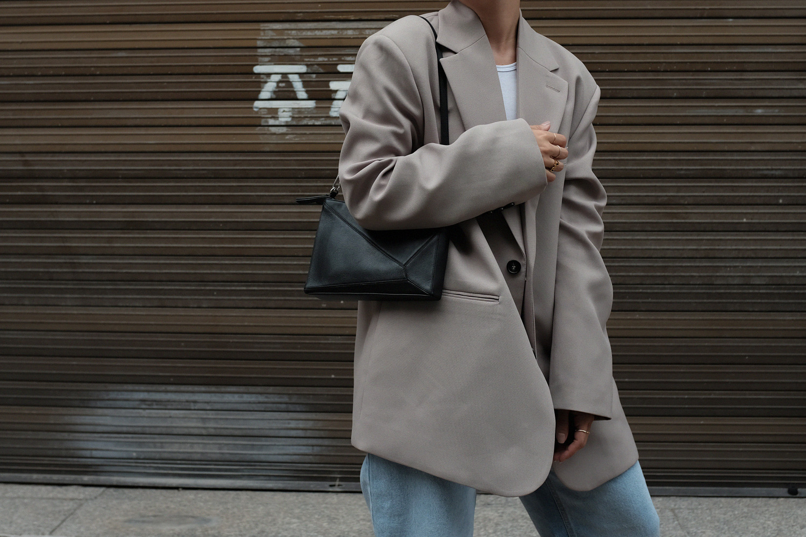 Oversized blazer (similar) from Korea. Wide jeans (similar) Stylenanda. Ribbed racer back top Arket. Mini shoulder bag (similar) Loewe. Sneakers Converse. Earrings by teetharejade.