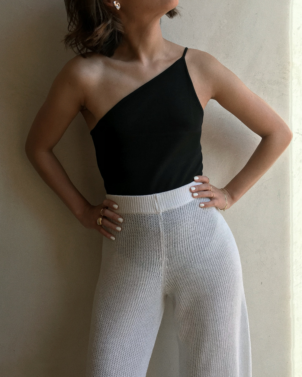 Als Trostpflaster habe ich hier noch die Outfit-Details und Alternativen zu einem meiner liebsten Urlaubs-Looks herausgesucht – asymmetrischer Badeanzug, eine weiße gestrickte Hose und Sandalen (gerne auch Flache) – super chic!