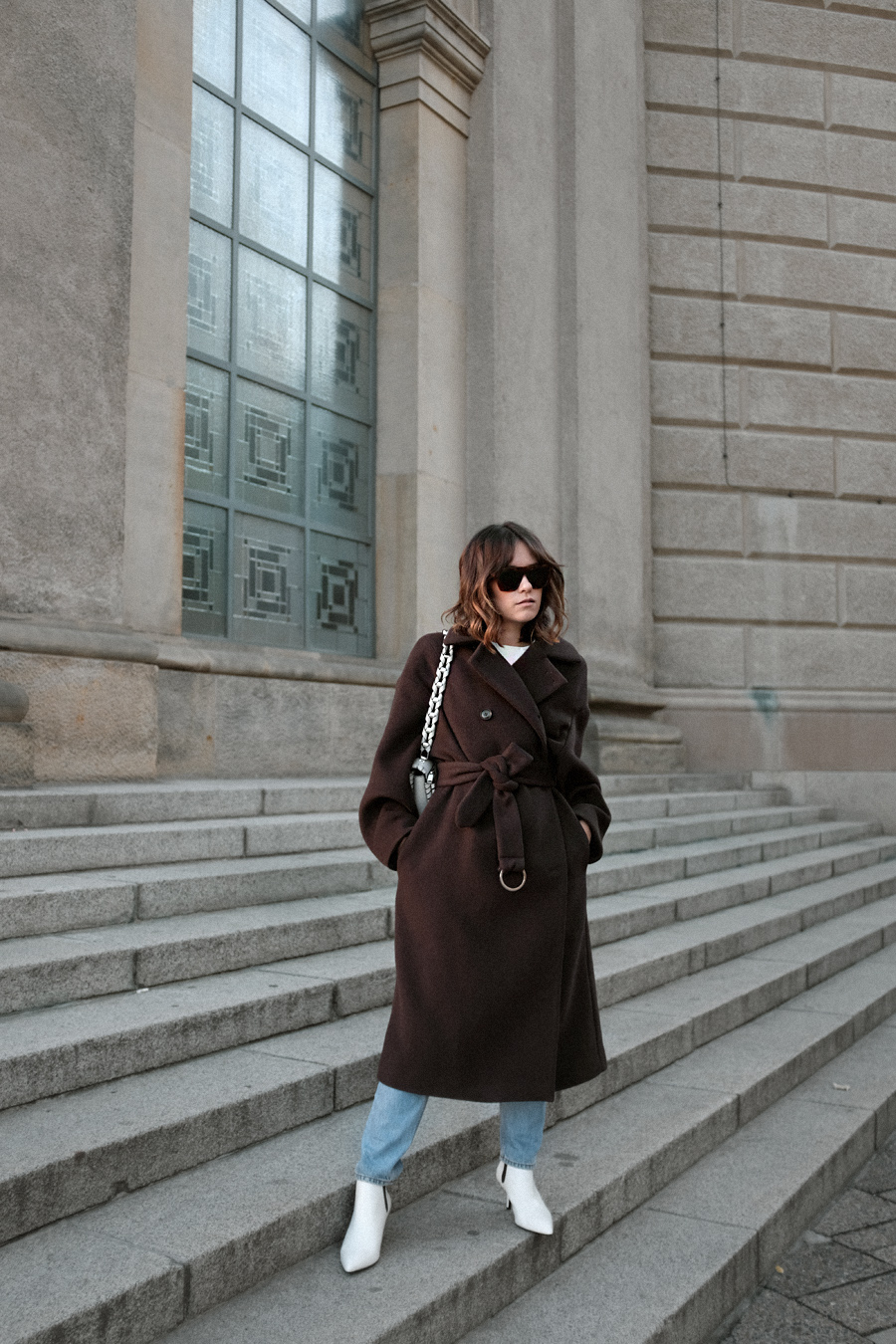 Brown belted coat – & Other Stories. Blue denim jeans – Monki. White ankle boots – & Other Stories. Sunglasses – Céline. „Hava“ bag – Proenza Schouler (similar).