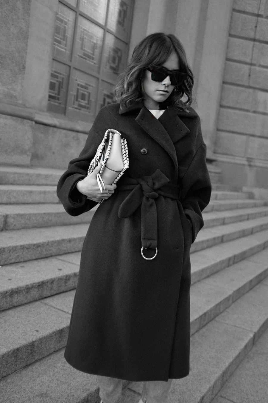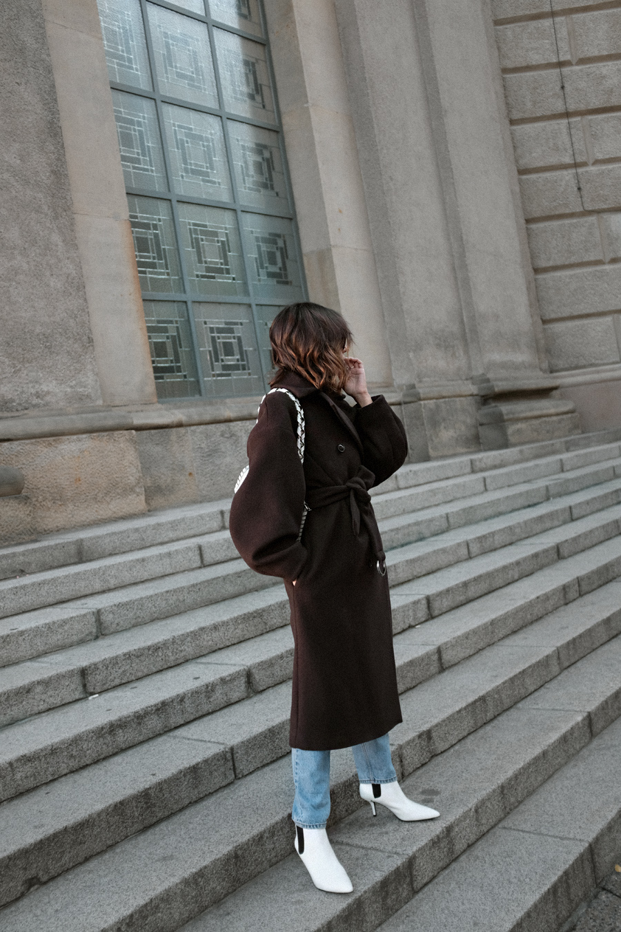 wearingBrown belted coat – & Other Stories. Blue denim jeans – Monki. White ankle boots – & Other Stories. Sunglasses – Céline. „Hava“ bag – Proenza Schouler (similar).