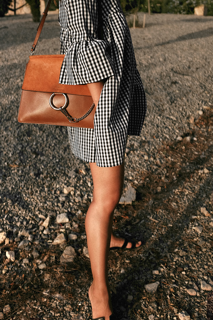 Vichy print dress – Zara (similar). „Oran“ Sandals – Hermès (similar here or here). „Faye“ bag – Chloé. Earrings – Mango.