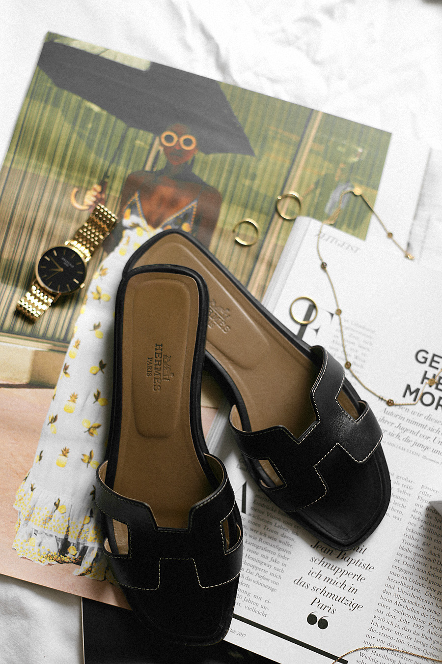 in this photoOran Sandals – Hermès (similar). „Upper East Side“ Watch – Rosefield.