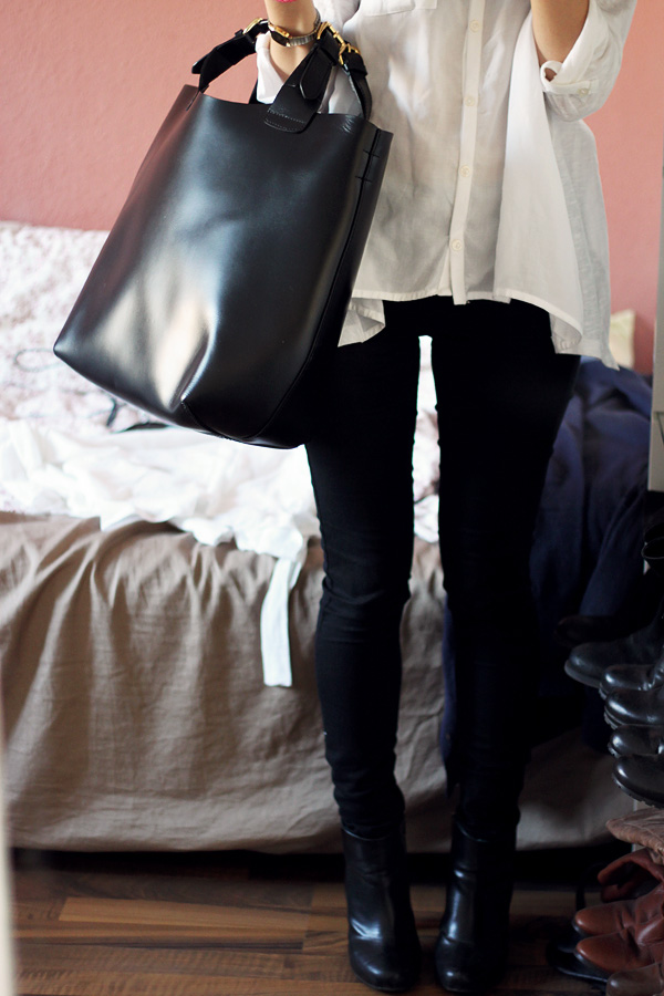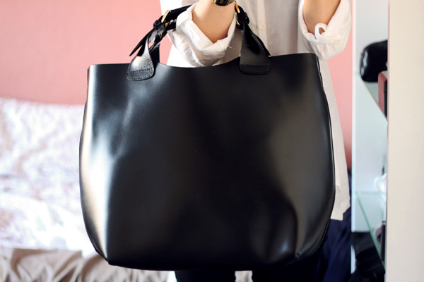 Vor einer Weile habe ich ja mal den Zara Onlineshop ausprobiert und unter anderem diese Tasche gekauft (von den anderen Sachen habe ich gerade leider keine Fotos). An sich ist sie perfekt! Ich mag die Form, dieses steife glatte Leder mit den Flechtdetails und den Schnallen. Aber alles schön und gut – für mich ist sie einfach nur viel zu riesig! Mit den Maßen auf der Website habe ich sie anders erwartet und an großen Frauen geht die vielleicht noch in Ordnung… aber leider nicht bei der kleinen Nisi :D Sie ging also zurück und ich bin noch auf der Suche nach meinem perfekten schwarzen harten Ledershopper :D