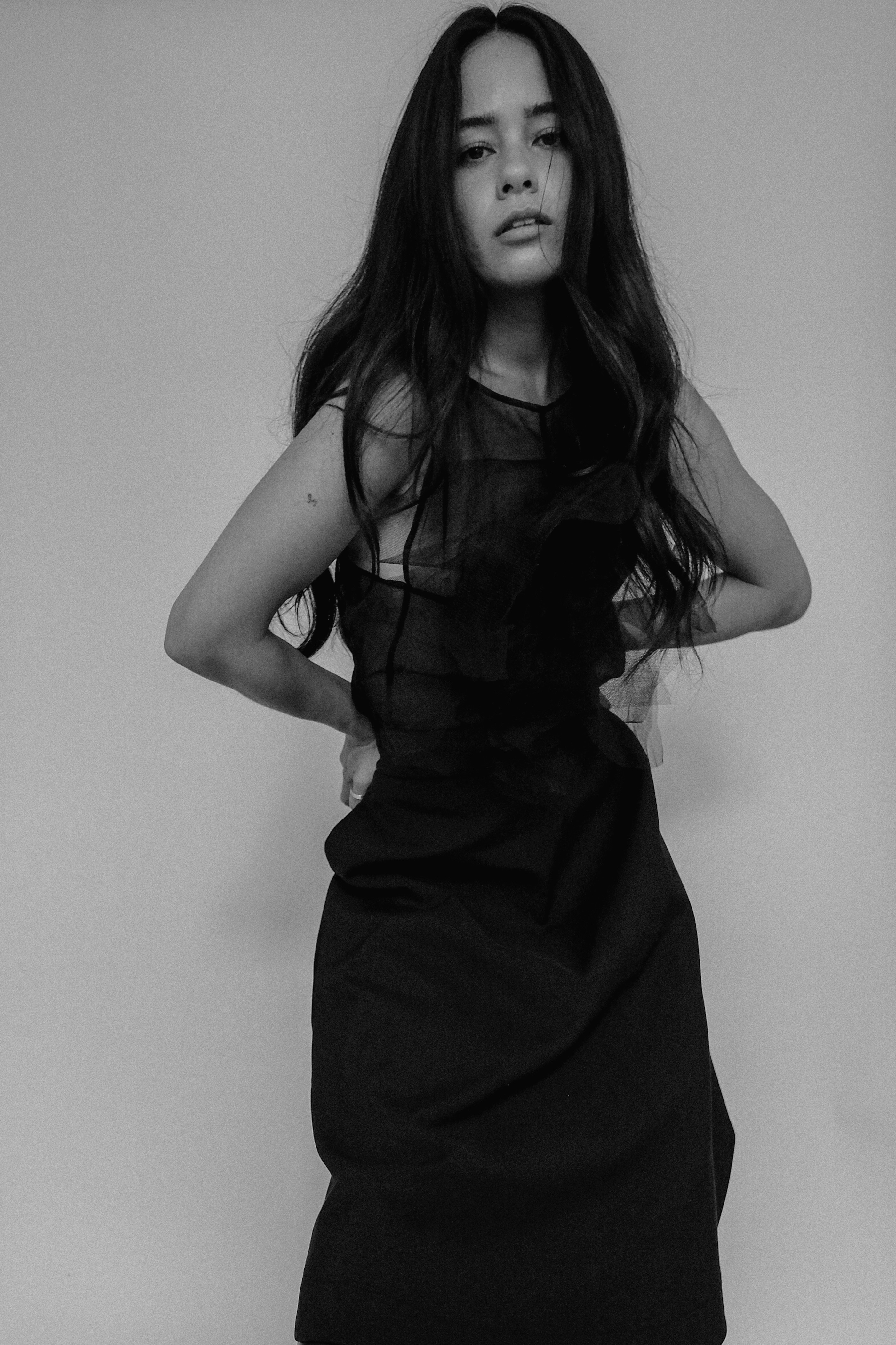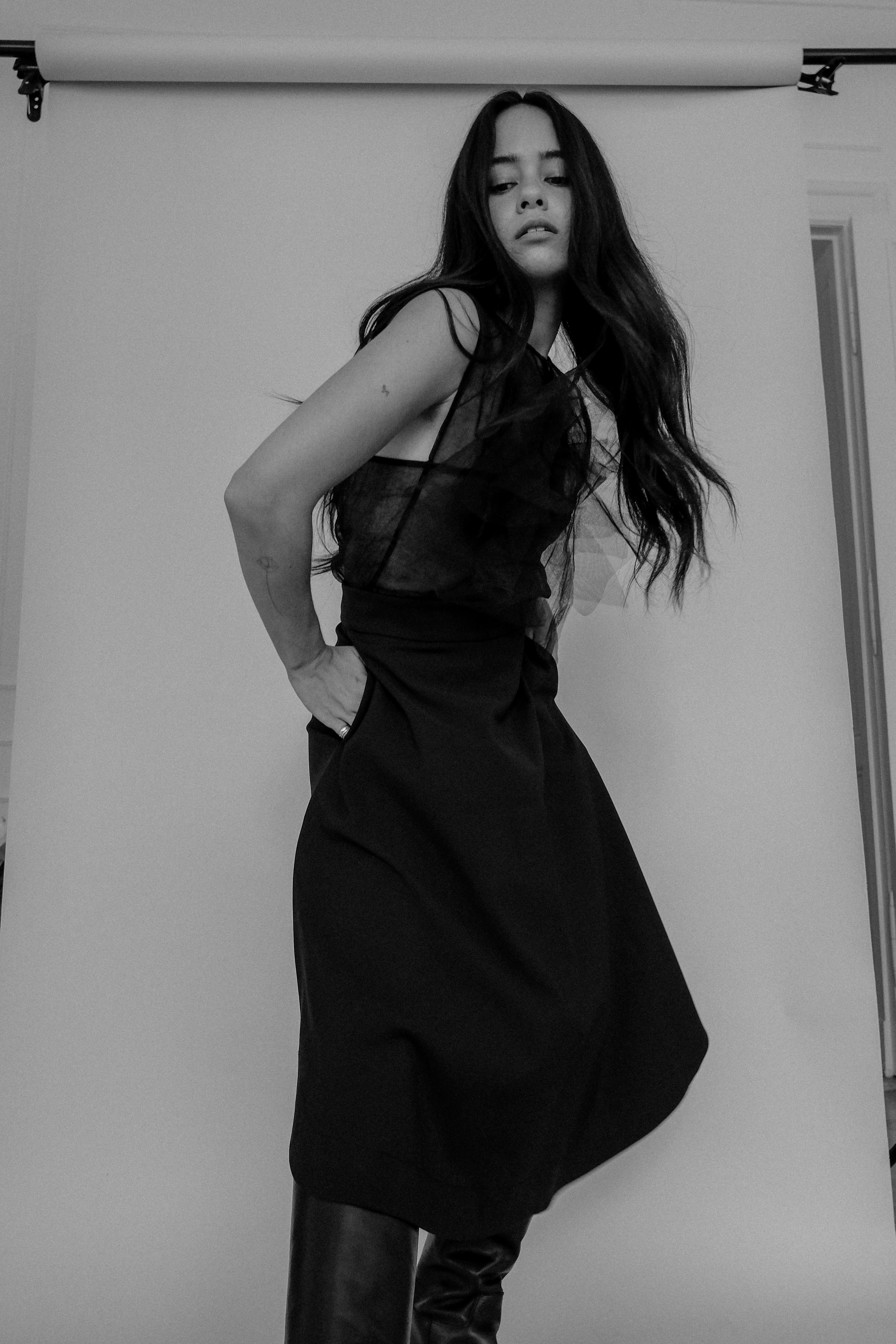 wearingTulle blouse Irene Luft. A-line skirt Arket. Knee-high boots (similar) Shop Amomento.