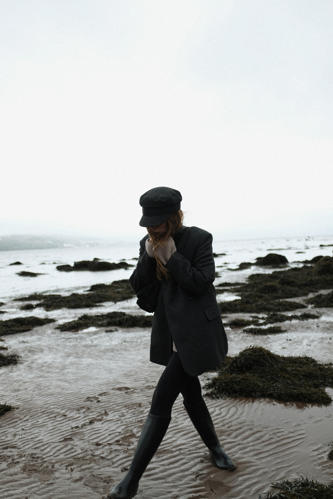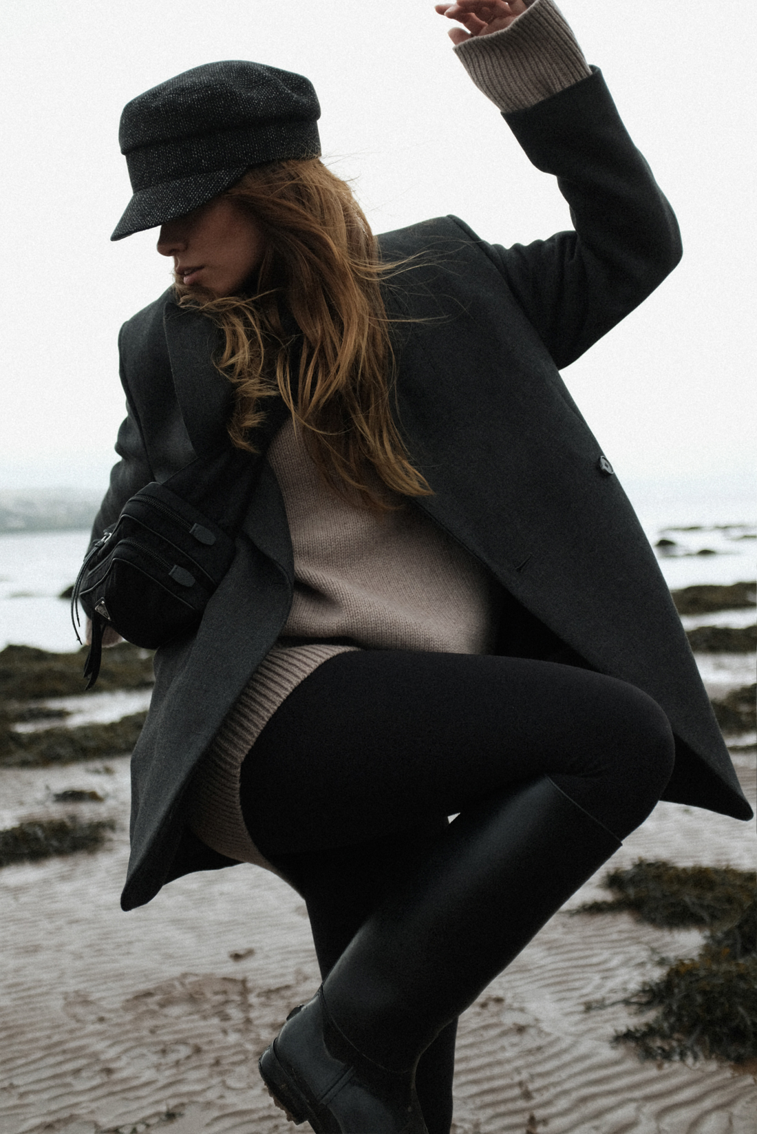 Die altbekannte Go-To Kombi, wenn es einfach und bequem sein soll: Leggings und ein oversized Pullover – ob als Travel-Outfit mit Sneakers, mit flachen Mules für kurze Erledigungen in der Stadt oder mit dicken Kuschel-Socken für zu Hause. Und genau das letzte Szenario war der Ausgangspunkt von meinem Look. Zuvor noch saß ich mit meinen dicken Socken und der Leggings-Pullover-Kombi vor dem Kamin, bevor ich in die Gummistiefel schlüpfte für einen kleinen Spaziergang am Wasser. Um die mild-kühle schottische Luft zu genießen, warf ich mir noch einen dicken Wollblazer über und setzte mir die Bakerboy-Mütze auf, meinen neuesten, aber nicht mehr wegzudenkenden Herbstbegleiter.